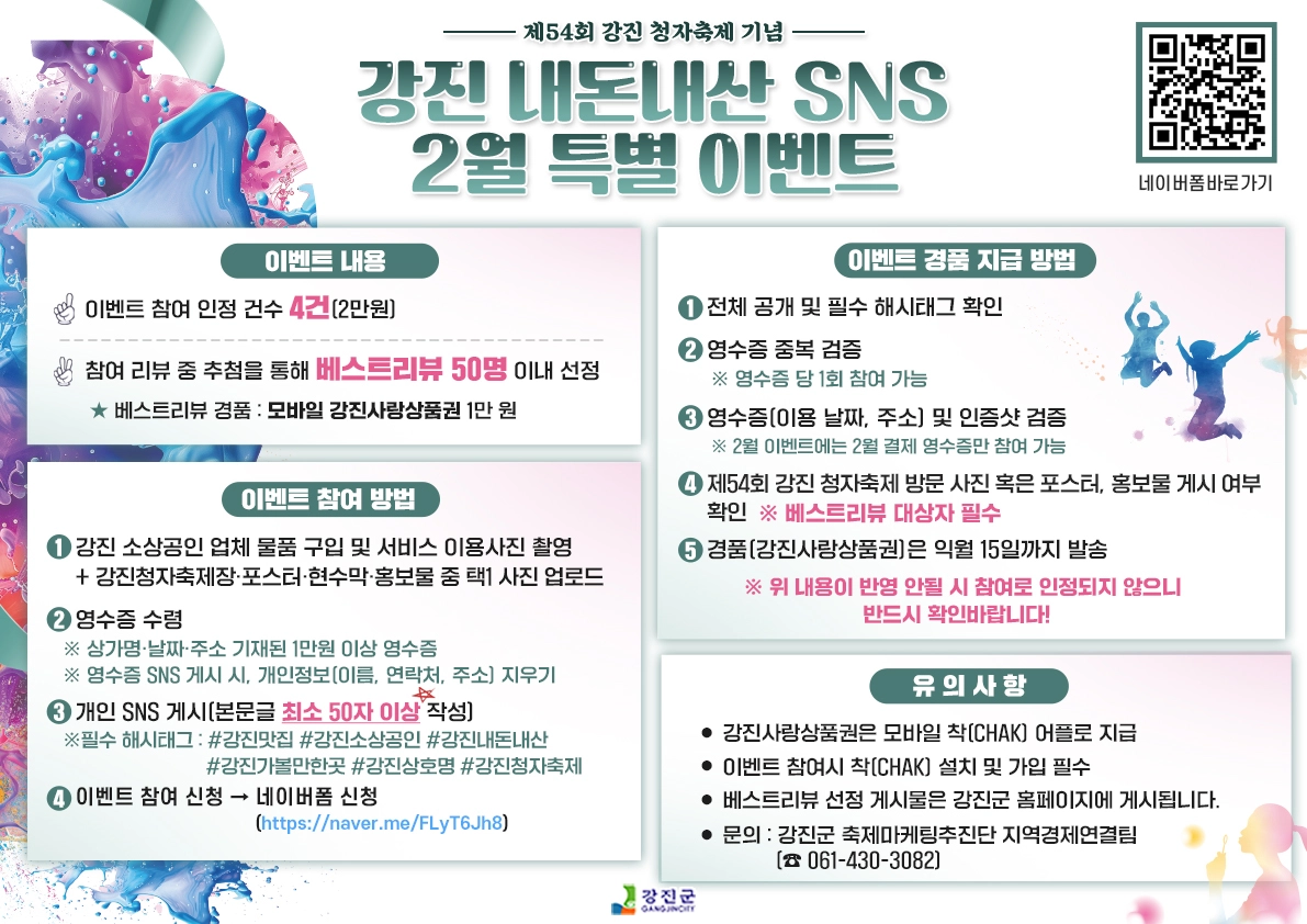 강진군이 관내 소상공인 업소 활성화와 홍보 지원을 위해 추진 중인 ‘강진군 내돈내산 SNS 리뷰 이벤트’를 제54회 강진 청자 축제 기념으로 2월 한 달간 특별 진행한다.