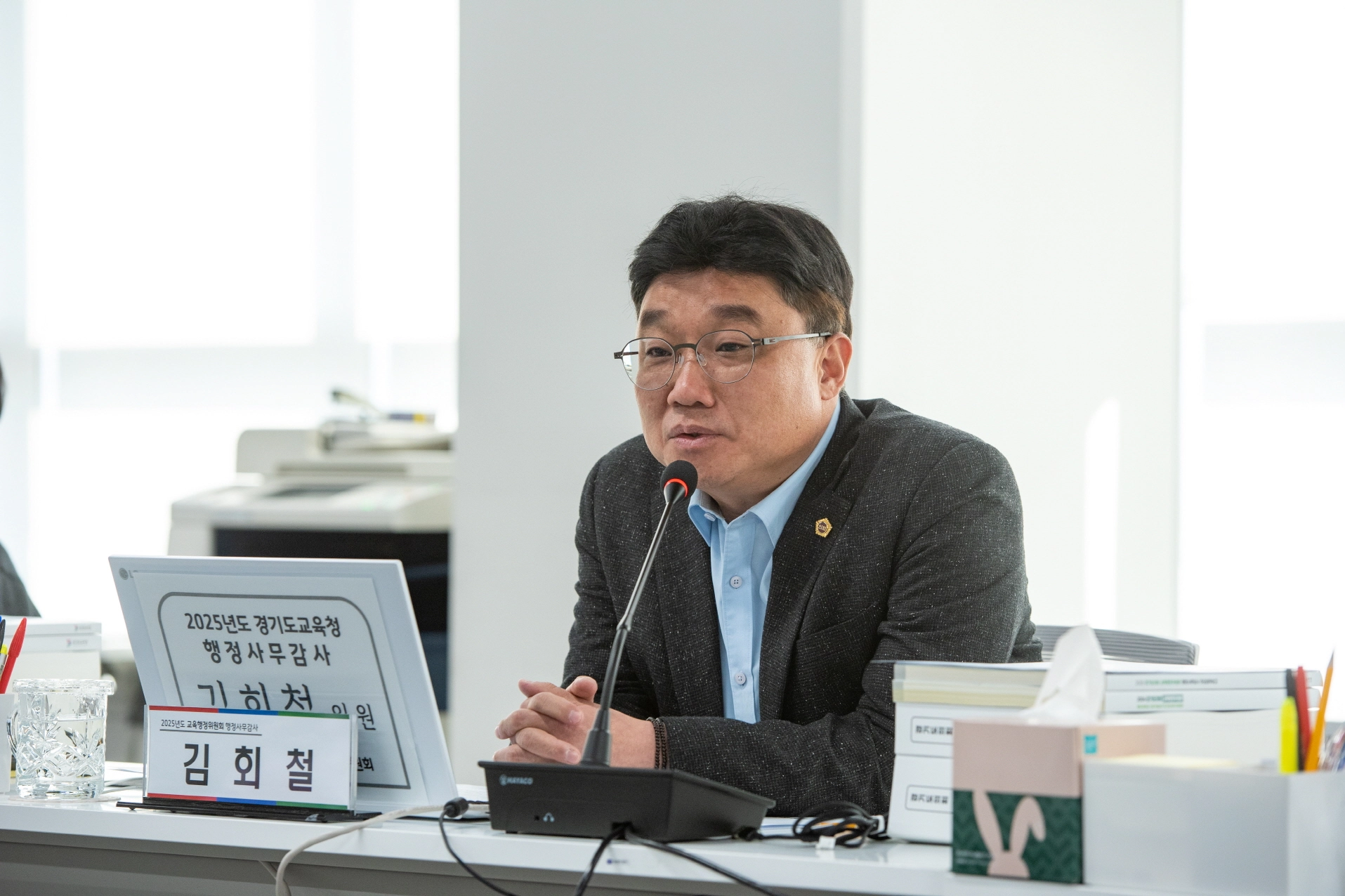 김회철 의원이 20일 열린 제387회 교육행정위원회 경기도교육청 총괄 행정사무감사에서 피감기관을 상대로 질의하고 있다.(사진=경기도의회)