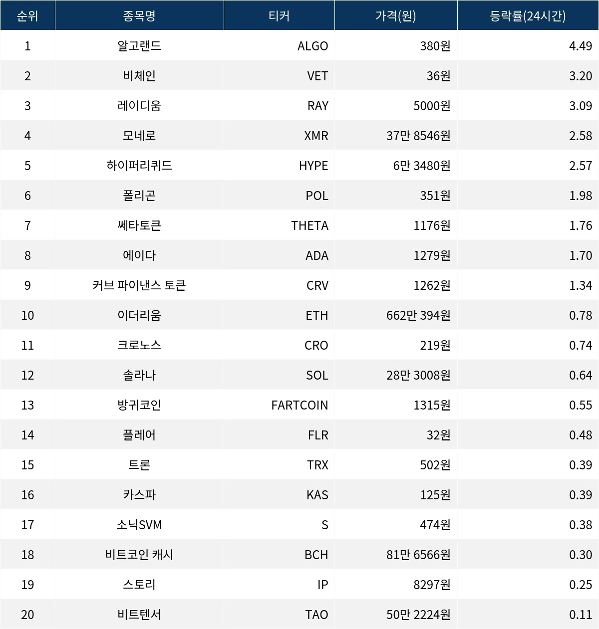 [서울데이터랩]알고랜드 비체인 레이디움 24시간 상승률 상위