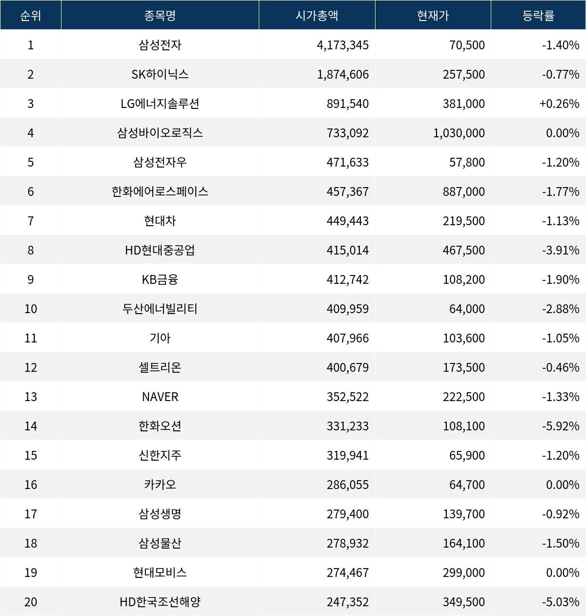 시가총액 상위 20위권 종목들은 기아(000270) ▼1.05%, 셀트리온(068270) ▼0.46%, NAVER(035420) ▼1.33%, 한화오션(042660) ▼5.92%, 신한지주(055550) ▼1.20%, 카카오(035720) 보합, 삼성생명(032830) ▼0.92%, 삼성물산(028260) ▼1.50%, 현대모비스(012330) 보합, HD한국조선해양(009540) ▼5.03% 등의 성적을 기록하고 있다.