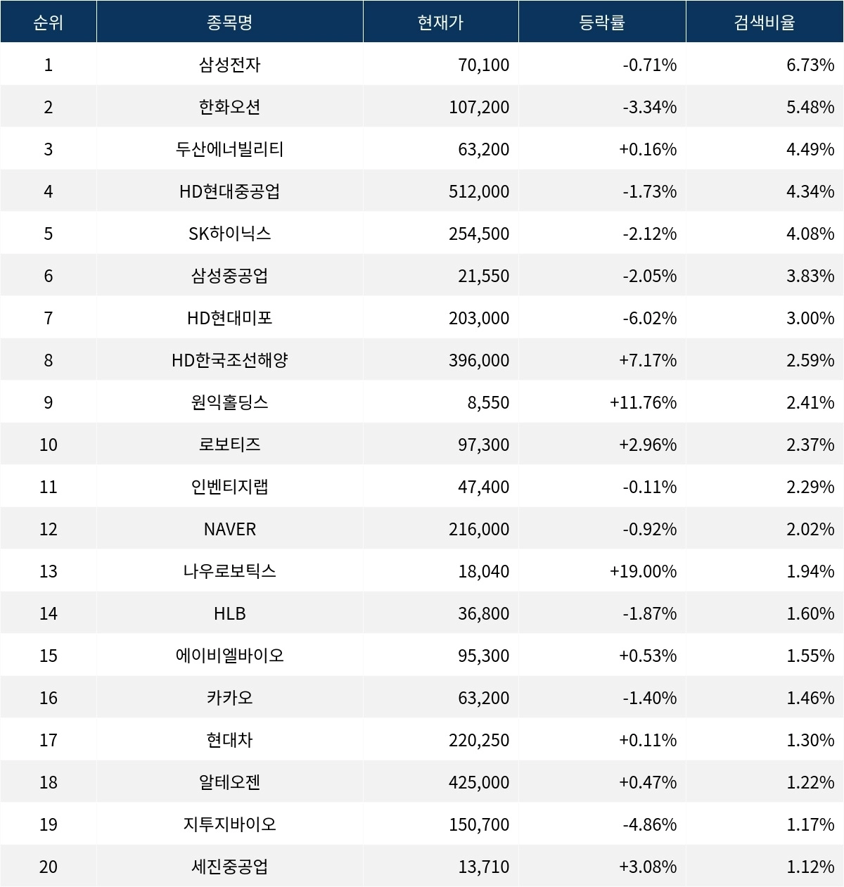 이어 한화오션(042660)이 검색비율 2위를 기록하며 3.34%의 하락세를 기록하고 있다. 검색비율 3위의 두산에너빌리티(034020)는 0.16% 상승하며 순조롭게 출발하는 모습이다. 검색비율 4위 HD현대중공업(329180)은 개장 초반부터 1.73%의 하락률로 하락 중이다. 검색비율 5위 SK하이닉스(000660)는 2.12% 하락하며 주가가 다소 하락하고 있다.
