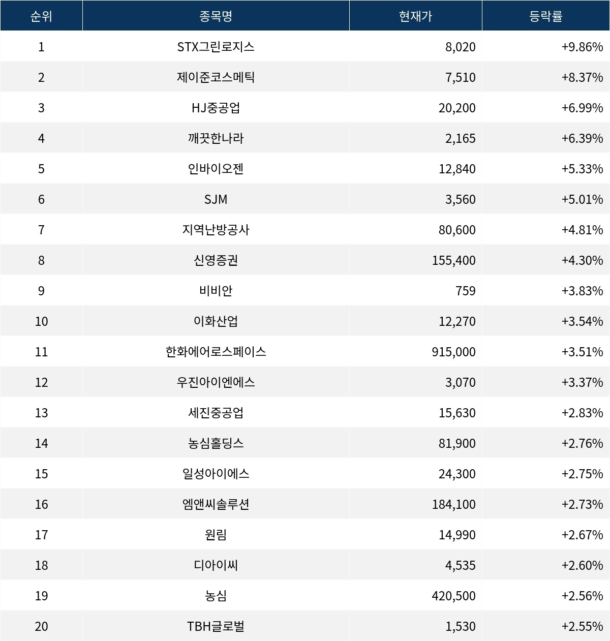 6위 SJM(123700)은 현재가 3,560원으로 5.01% 상승 중이다. 7위 지역난방공사(071320)는 현재가 80,600원으로 4.81% 상승 중이다. 8위 신영증권(001720)은 현재가 155,400원으로 4.30% 상승 중이다. 9위 비비안(002070)은 현재가 759원으로 3.83% 상승 중이다. 10위 이화산업(000760)은 현재가 12,270원으로 3.54% 상승 중이다.
