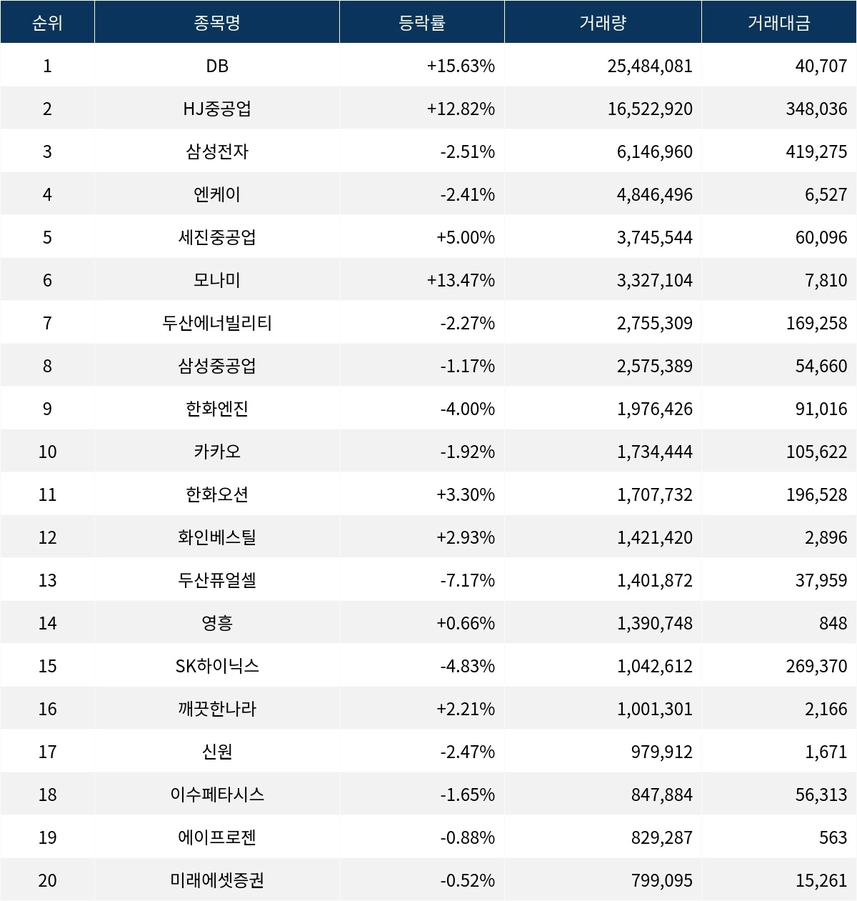 한편 거래량 상위 20위권 종목들은 한화오션(042660) ▲3.30%, 화인베스틸(133820) ▲2.93%, 두산퓨얼셀(336260) ▼7.17%, 영흥(012160) ▲0.66%, SK하이닉스(000660) ▼4.83%, 깨끗한나라(004540) ▲2.21%, 신원(009270) ▼2.47%, 이수페타시스(007660) ▼1.65%, 에이프로젠(007460) ▼0.88%, 미래에셋증권(006800) ▼0.52% 등의 성적을 기록했다.