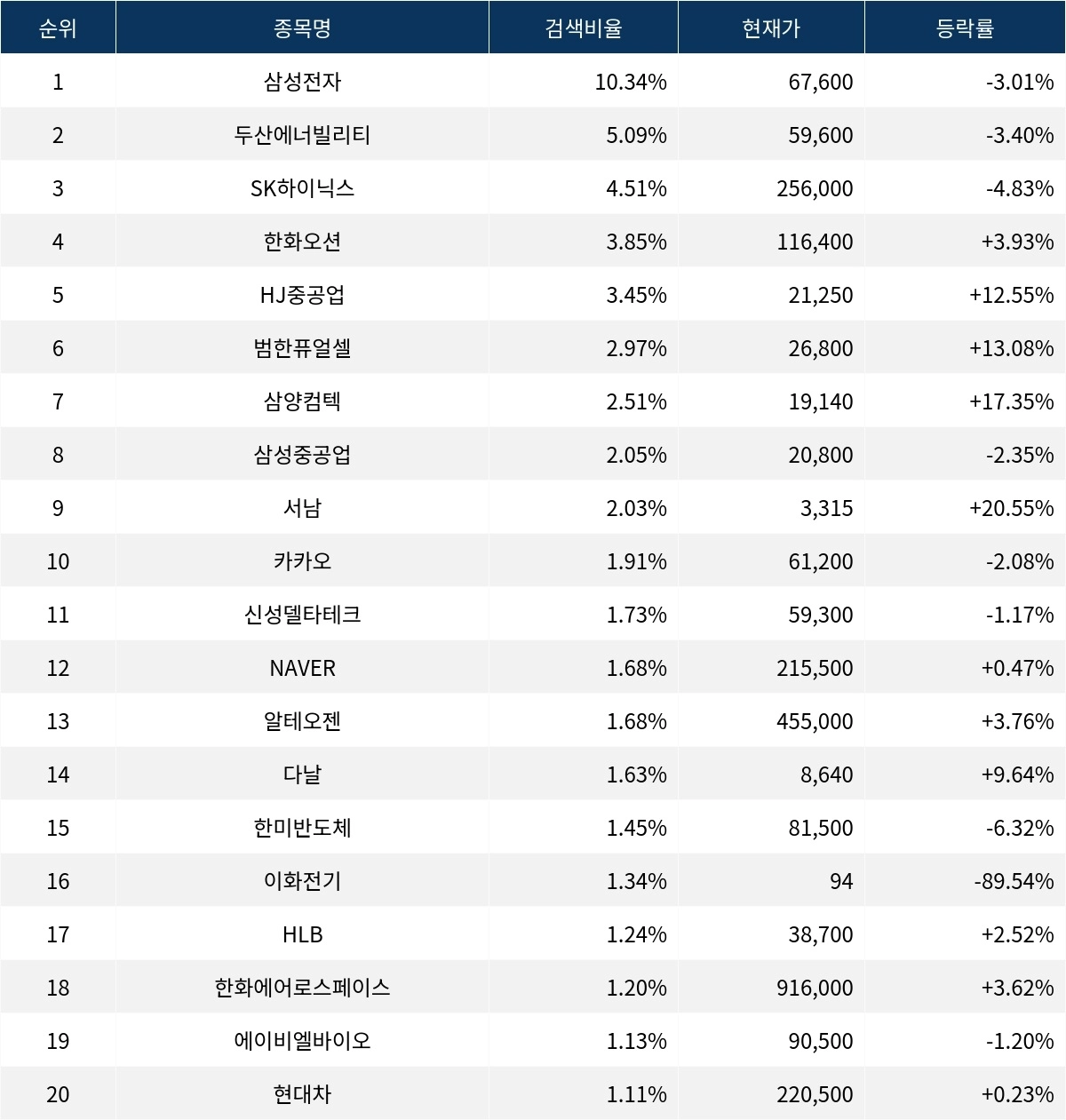 이어 검색비율 2위의 두산에너빌리티(034020)는 하락률 3.40%로 하락 마감했다. 검색비율 3위의 SK하이닉스(000660)는 4.83% 하락 마감했다. 검색비율 4위 한화오션(042660)은 상승률 3.93%로 상승 마감했다. 검색비율 5위 HJ중공업(097230)은 12.55% 급등 마감했다.