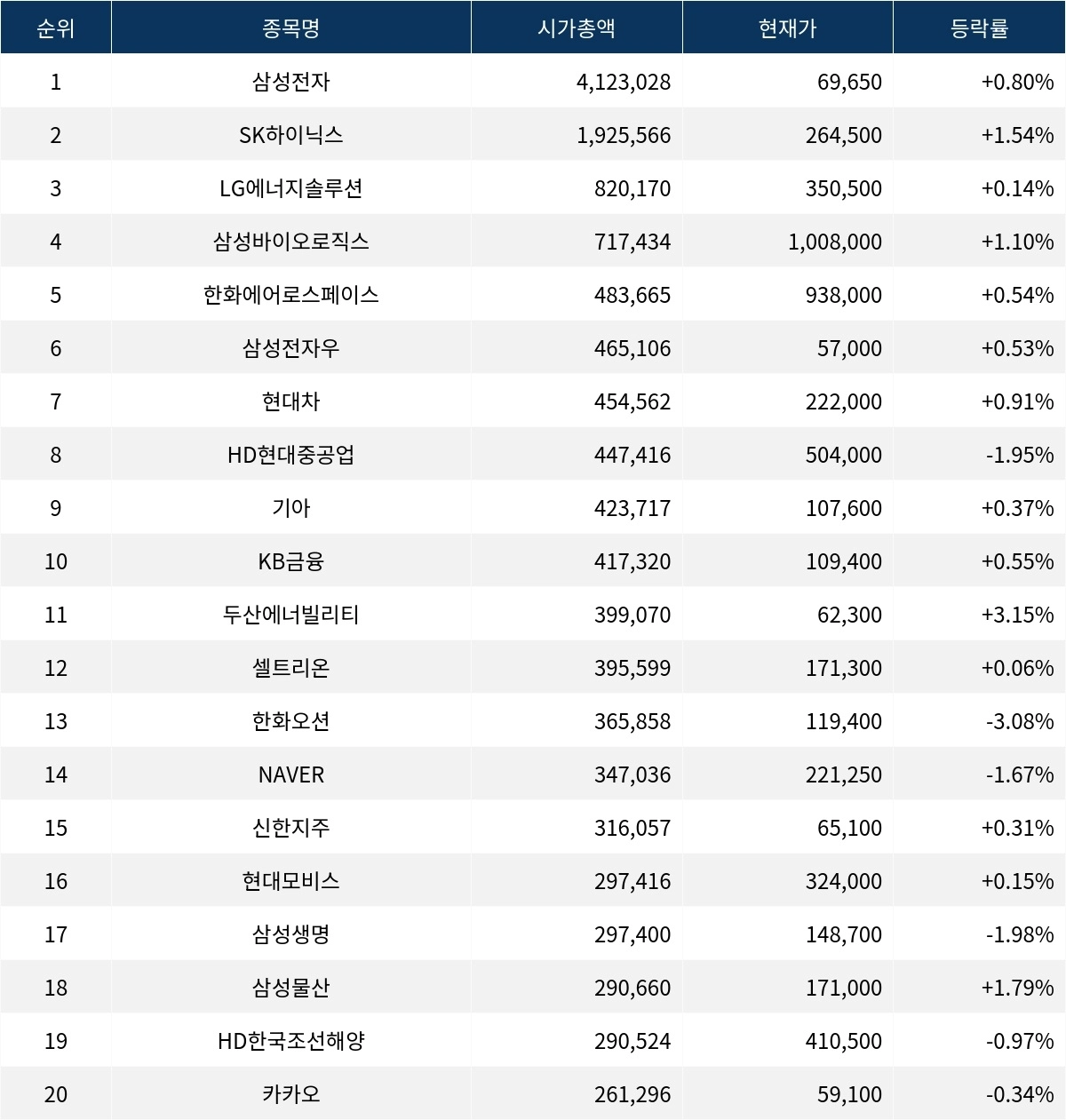 한편 시가총액 20위권 종목들은 두산에너빌리티(034020) ▲3.15%, 셀트리온(068270) ▲0.06%, 한화오션(042660) ▼3.08%, NAVER(035420) ▼1.67%, 신한지주(055550) ▲0.31%, 현대모비스(012330) ▲0.15%, 삼성생명(032830) ▼1.98%, 삼성물산(028260) ▲1.79%, HD한국조선해양(009540) ▼0.97%, 카카오(035720) ▼0.34% 등의 성적을 기록하고 있다.