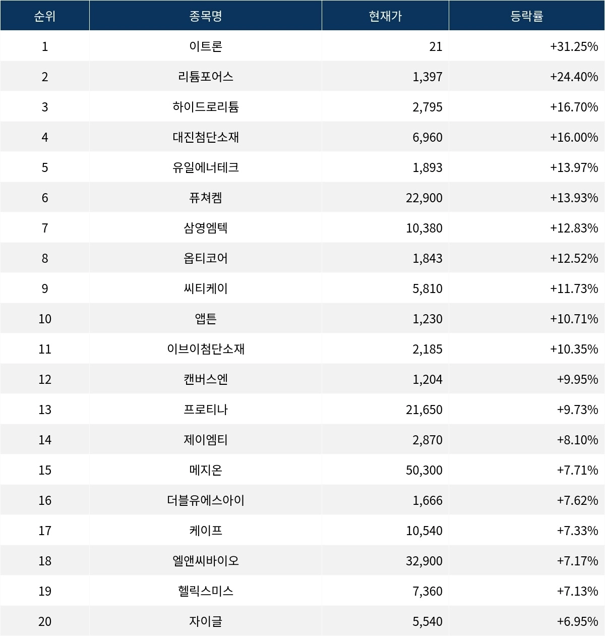 6위 퓨쳐켐(220100)은 현재가 22,900원으로 13.93% 상승 중이다. 7위 삼영엠텍(054540)은 현재가 10,380원으로 12.83% 상승 중이다. 8위 옵티코어(380540)는 현재가 1,843원으로 12.52% 상승 중이다. 9위 씨티케이(260930)는 현재가 5,810원으로 11.73% 상승 중이다. 10위 앱튼(270520)은 현재가 1,230원으로 10.71% 상승 중이다.