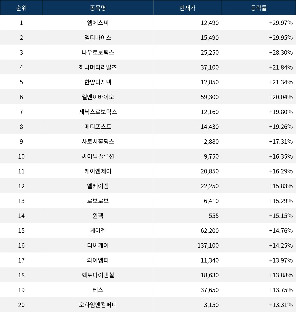 6위 엘앤씨바이오(290650)는 종가 59,300원으로 20.04% 급등 마감했다. 7위 제닉스로보틱스(381620)는 종가 12,160원으로 19.80% 급등 마감했다. 8위 메디포스트(078160)는 종가 14,430원으로 19.26% 급등 마감했다. 9위 사토시홀딩스(223310)는 종가 2,880원으로 17.31% 급등 마감했다. 10위 싸이닉솔루션(234030)은 종가 9,750원으로 16.35% 급등 마감했다.
