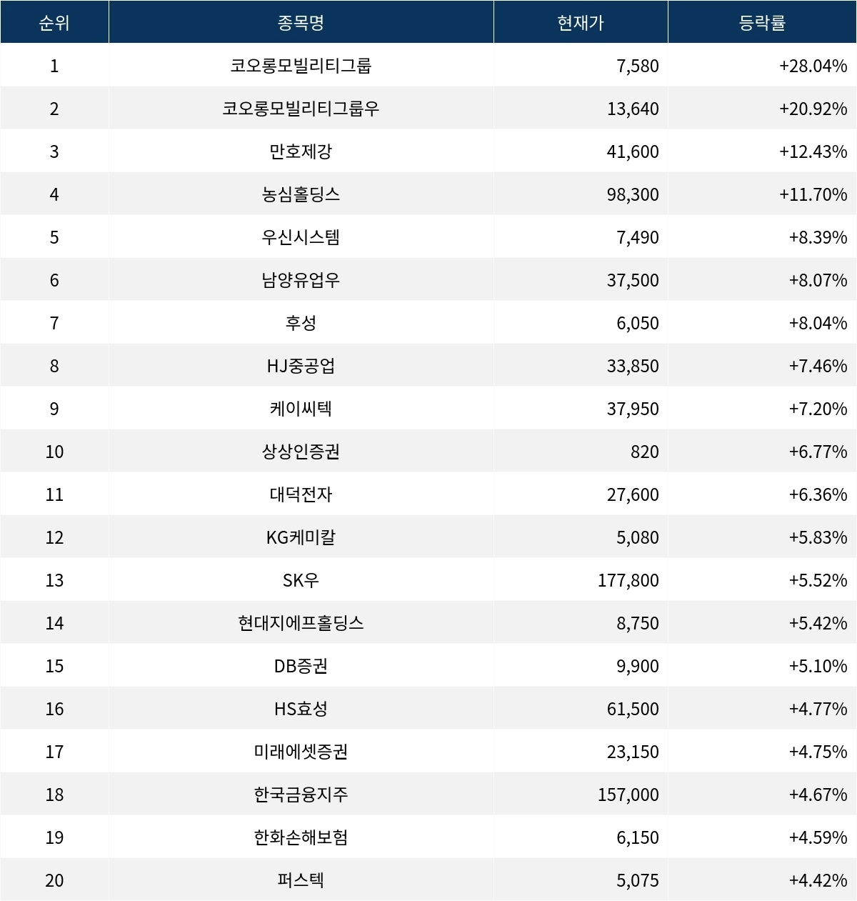 이밖에도 대덕전자(353200) ▲6.36%, KG케미칼(001390) ▲5.83%, SK우(03473K) ▲5.52%, 현대지에프홀딩스(005440) ▲5.42%, DB증권(016610) ▲5.10%, HS효성(487570) ▲4.77%, 미래에셋증권(006800) ▲4.75%, 한국금융지주(071050) ▲4.67%, 한화손해보험(000370) ▲4.59%, 퍼스텍(010820) ▲4.42% 등을 기록하며 시장에서 활발히 거래되고 있다.