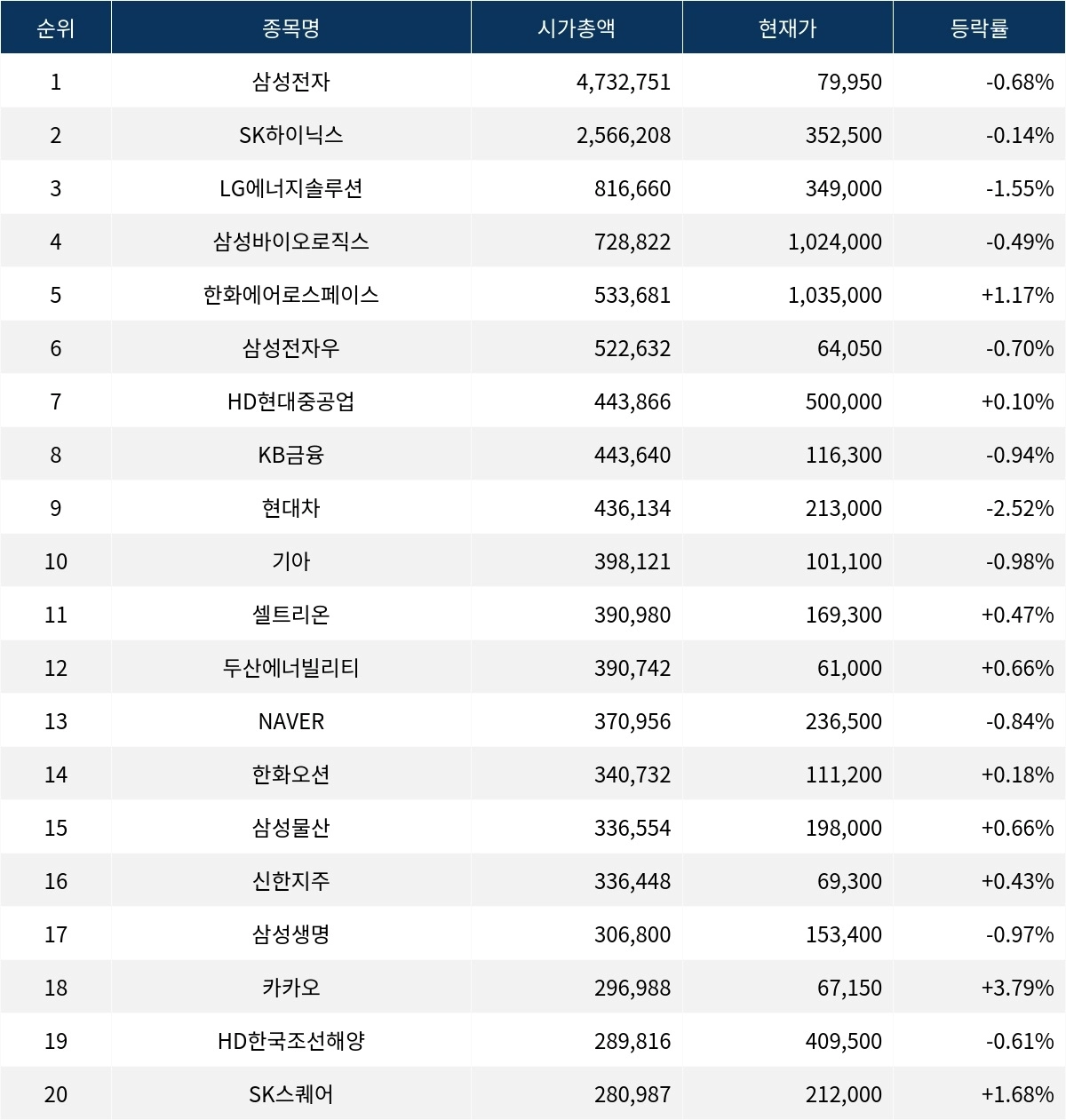 한편 시가총액 20위권 종목들은 셀트리온(068270) ▲0.47%, 두산에너빌리티(034020) ▲0.66%, NAVER(035420) ▼0.84%, 한화오션(042660) ▲0.18%, 삼성물산(028260) ▲0.66%, 신한지주(055550) ▲0.43%, 삼성생명(032830) ▼0.97%, 카카오(035720) ▲3.79%, HD한국조선해양(009540) ▼0.61%, SK스퀘어(402340) ▲1.68% 등의 성적을 기록하고 있다.