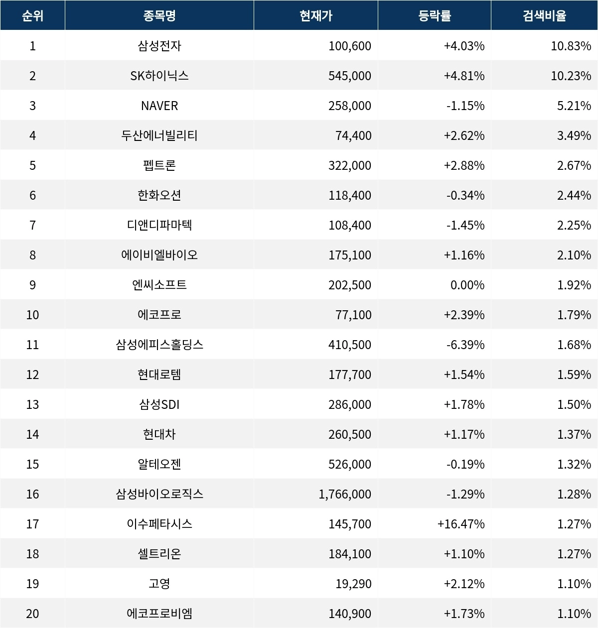 이 밖에도 이수페타시스(007660) ▲16.47%, SK하이닉스 ▲4.81%, 삼성전자 ▲4.03%, 에코프로 ▲2.39%, 두산에너빌리티 ▲2.62%, 펩트론 ▲2.88%, 현대차(005380) ▲1.17%, 삼성SDI(006400) ▲1.78%, 에이비엘바이오 ▲1.16%, 셀트리온(068270) ▲1.10% 등이 많이 검색되고 있다.