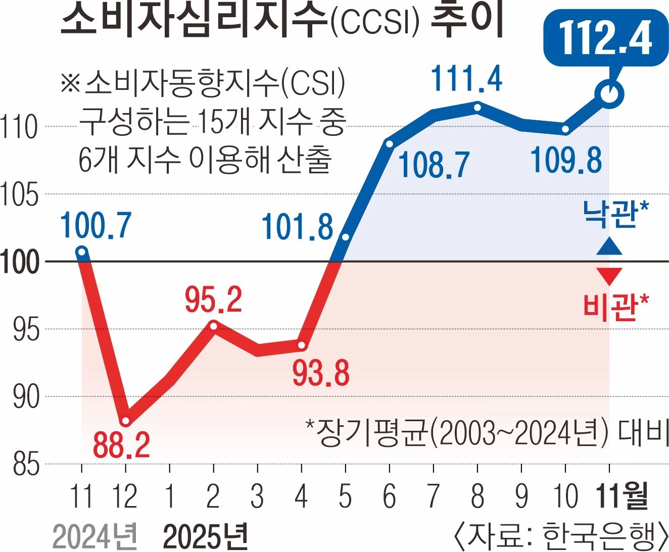 한국은행이 25일 발표한 소비자동향조사 결과를 보면 11월 소비자심리지수(CCSI)는 112.4로 전월보다 2.6 포인트 상승하며 2017년 11월 이후 최고치를 나타냈다. 한은은 작년 말 계엄 사태로 급락했던 지수가 기저효과에 더해 한미 관세 협상 타결, 미·중 통상 환경 개선 등 대외 불확실성 완화로 되살아난 것이라고 진단했다.