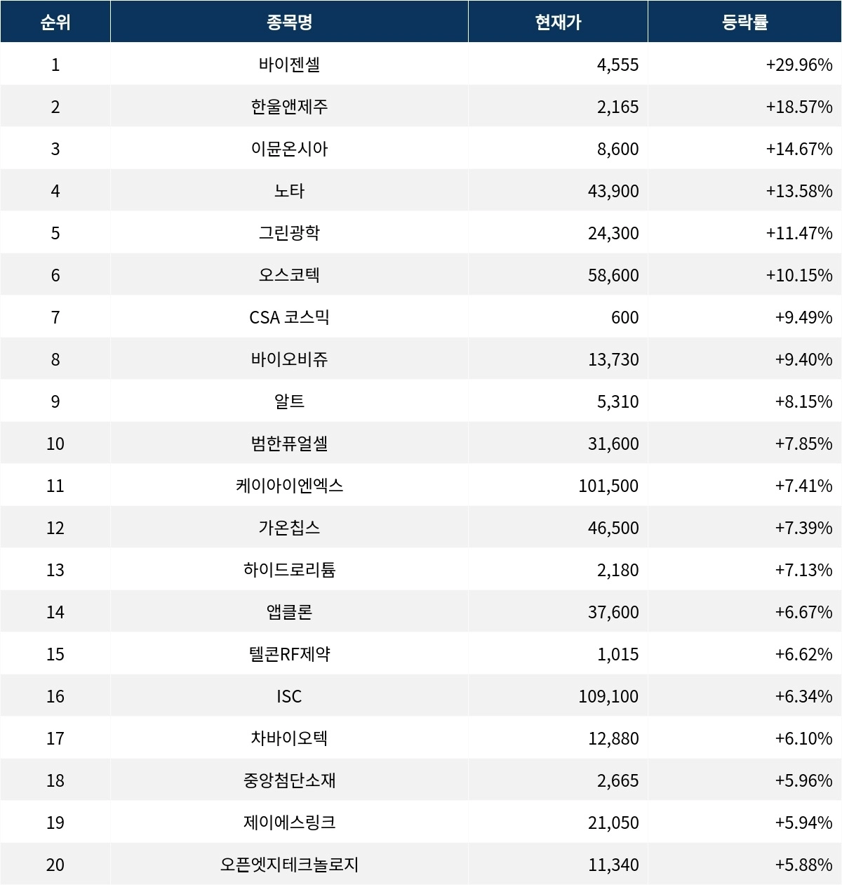 이밖에도 케이아이엔엑스(093320) ▲7.41%, 가온칩스(399720) ▲7.39%, 하이드로리튬(101670) ▲7.13%, 앱클론(174900) ▲6.67%, 텔콘RF제약(200230) ▲6.62%, ISC(095340) ▲6.34%, 차바이오텍(085660) ▲6.10%, 중앙첨단소재(051980) ▲5.96%, 제이에스링크(127120) ▲5.94%, 오픈엣지테크놀로지(394280) ▲5.88% 등을 기록하며 시장에서 활발히 거래되고 있다.