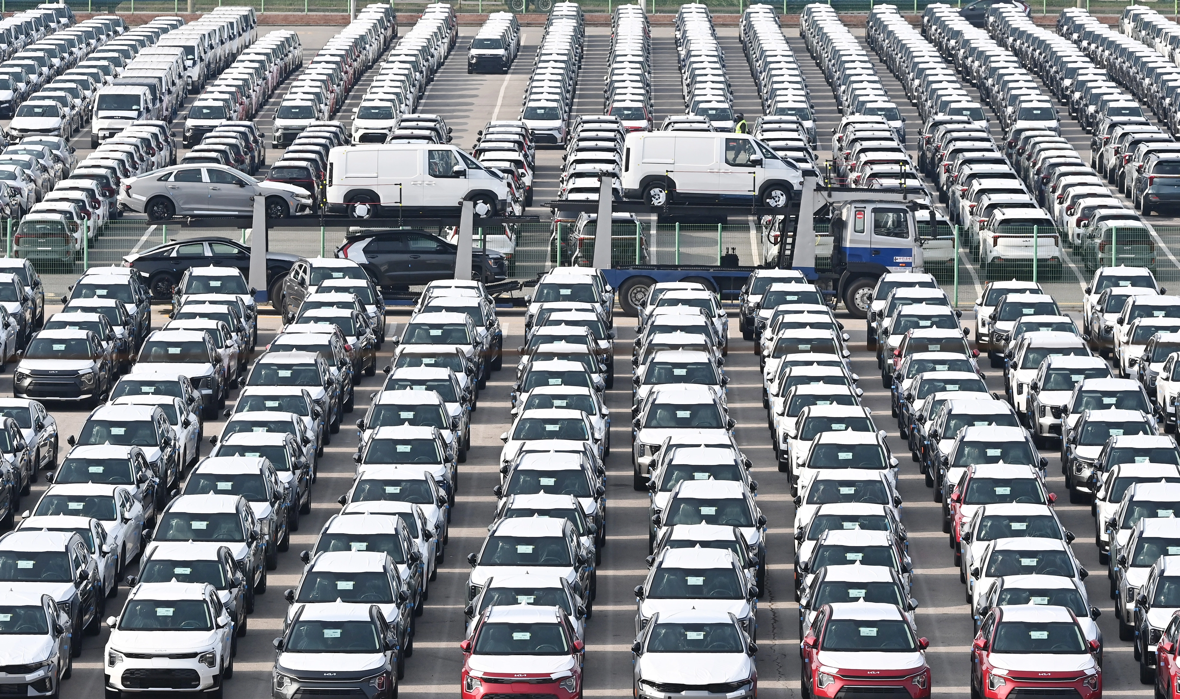 수출 대기중인 자동차 경기 평택항 자동차 전용부두에 선적을 기다리는 수출용 차량이 세워져 있다. 2025.10.30. 뉴시스