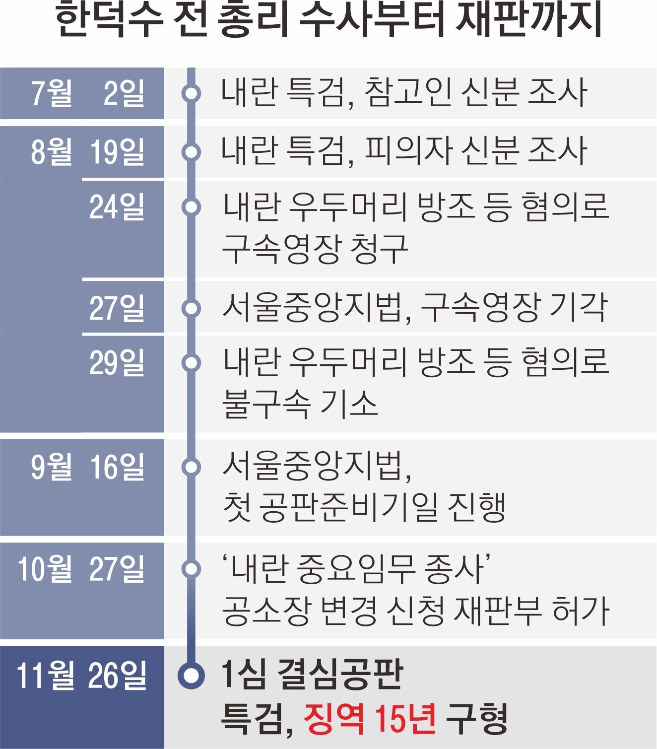 내란 특검이 내란 우두머리 방조, 내란 중요임무 종사 등 혐의로 재판에 넘겨진 한덕수 전 국무총리에게 징역 15년을 선고해 달라고 요청했다. 지난 8월 29일 특검이 불구속 기소한 지 약 3개월 만이다. 한 전 총리 재판은 내년 1월 21일에 선고된다. 12·3 비상계엄 재판 중 가장 빠른 것으로 윤석열 전 대통령 등 주요 피고인들의 재판에 가늠자가 될 것으로 보인다.