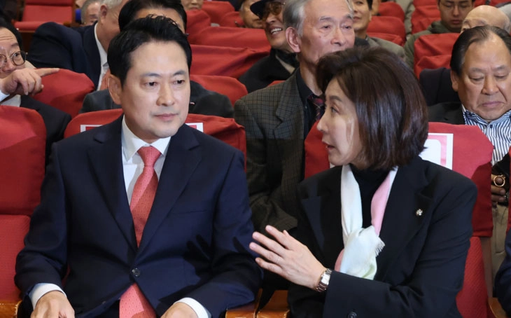 26일 국민의힘 장동혁(앞줄 왼쪽) 대표와 나경원 의원이 국회 의원회관에서 열린 ‘독립 외교 40년: 이승만의 외로운 투쟁’ 시사회에서 대화를 나누는 모습. 안주영 전문기자