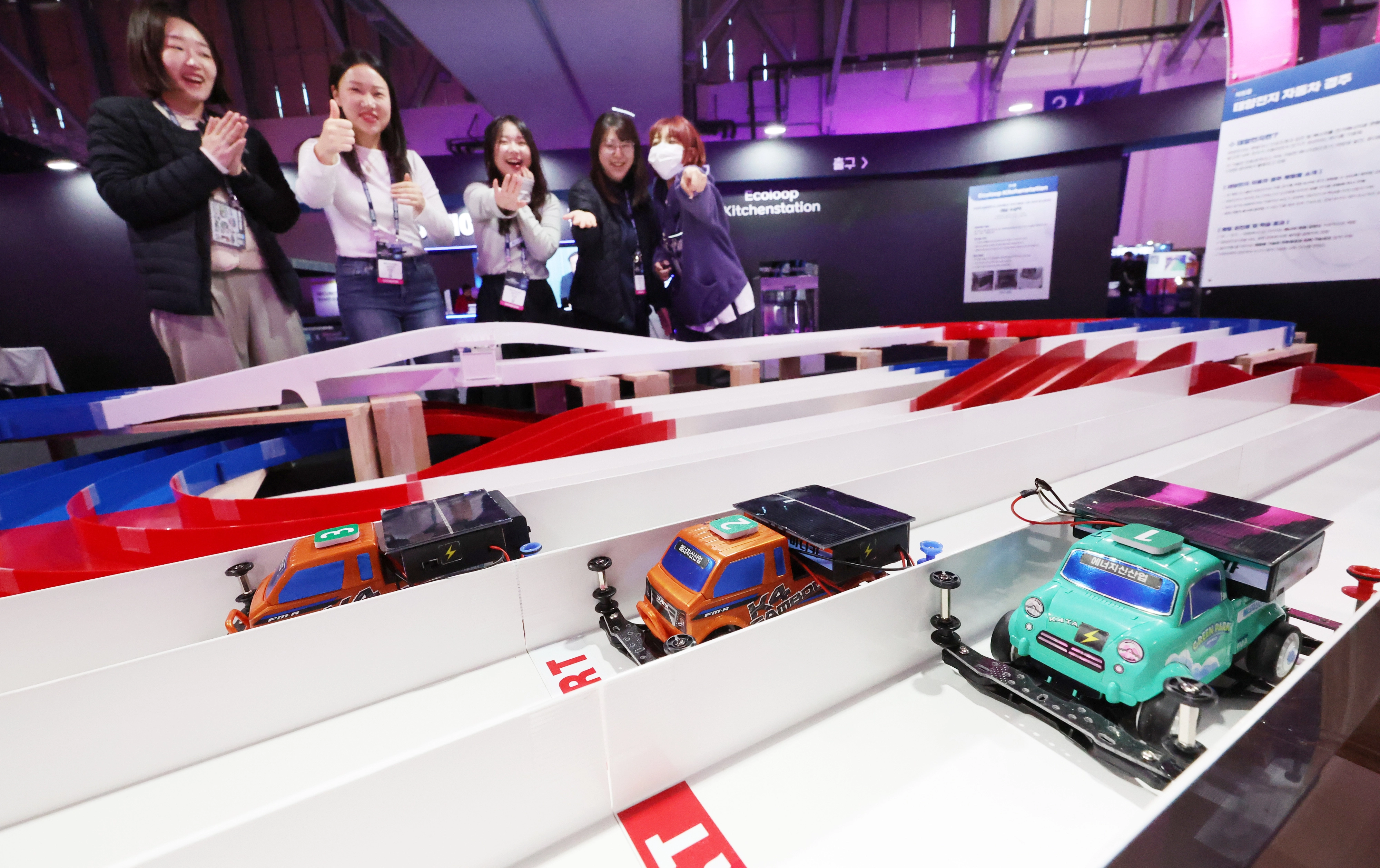 26일 부산 해운대구 벡스코 제1전시장에서 열린 ‘첨단분야 혁신융합대학 코-쇼(CO-SHOW)’에서 관람객들이 태양전지 자동차 경주를 체험하고 있다. 행사는 오는 29일까지 열린다.