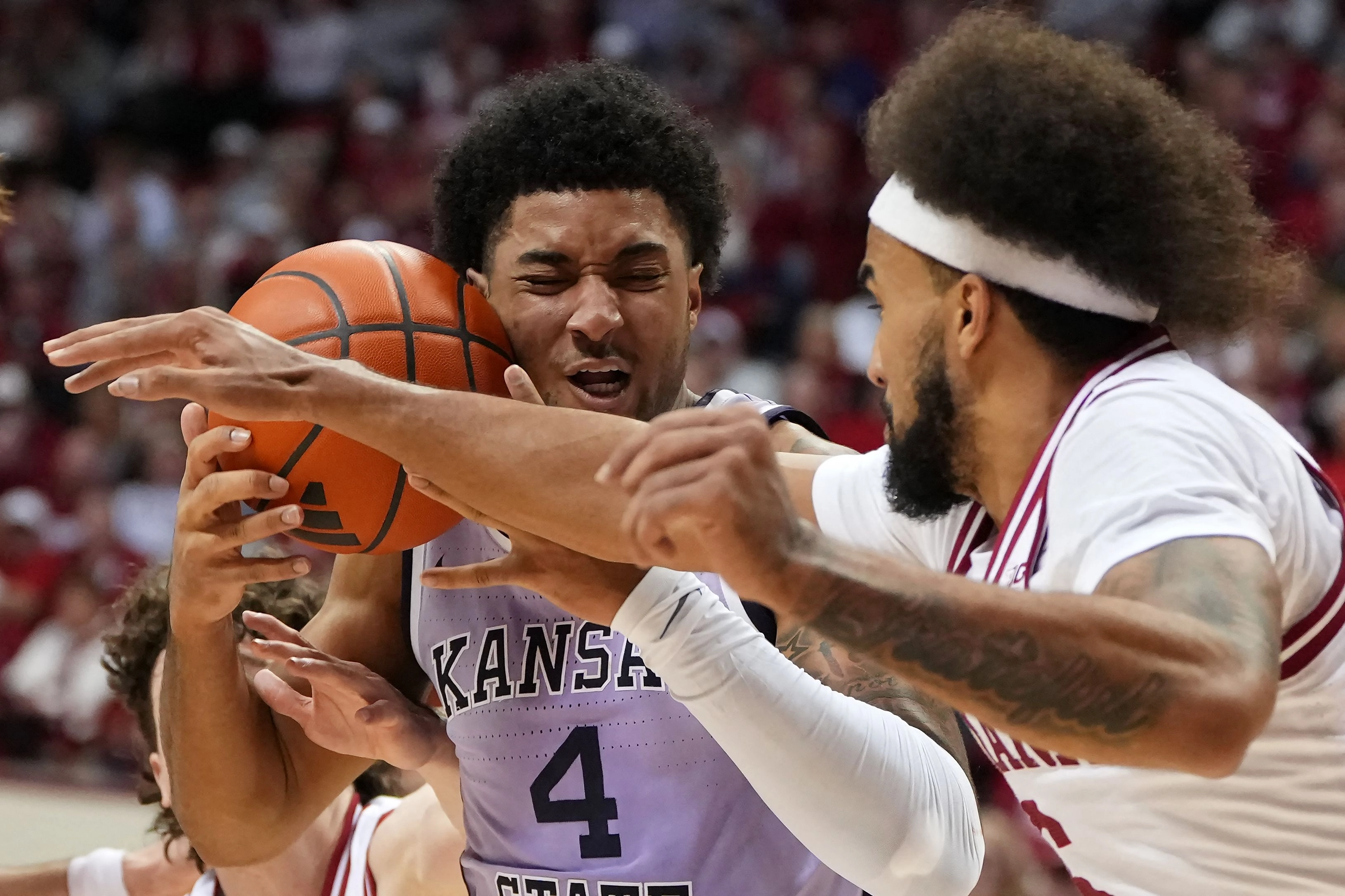 캔자스 스테이트 와일드캣츠의 P.J. 해거티(왼쪽)가 26일(한국시간) 미국 인디애나주 블루밍턴에서 열린 전미대학체육협회(NCAA) 남자 농구 인디애나 후시어스와의 경기 후반전에서 테이튼 코너웨이의 수비에 막혀 공을 얼굴에 대고 있다. NCAA 득점 선두인 해거티는 이날 12득점에 그쳤다. 인디애나는 캔자스 스테이트를 86-69로 꺾었다.