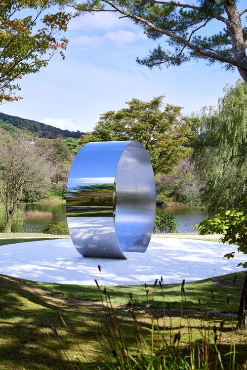 지난 24일 가을 색이 옅어진 경기 용인 호암미술관 옛돌정원. 그동안 공개되지 않았던 정원의 입구에는 가락지를 닮은 지름 5m의 은빛 원이 들어서 있었다. ‘관계항-만남’이라는 이름이 붙은 작품은 세계적인 현대미술가 이우환(89)이 서정주의 시에서 영감을 받아 만들었다.