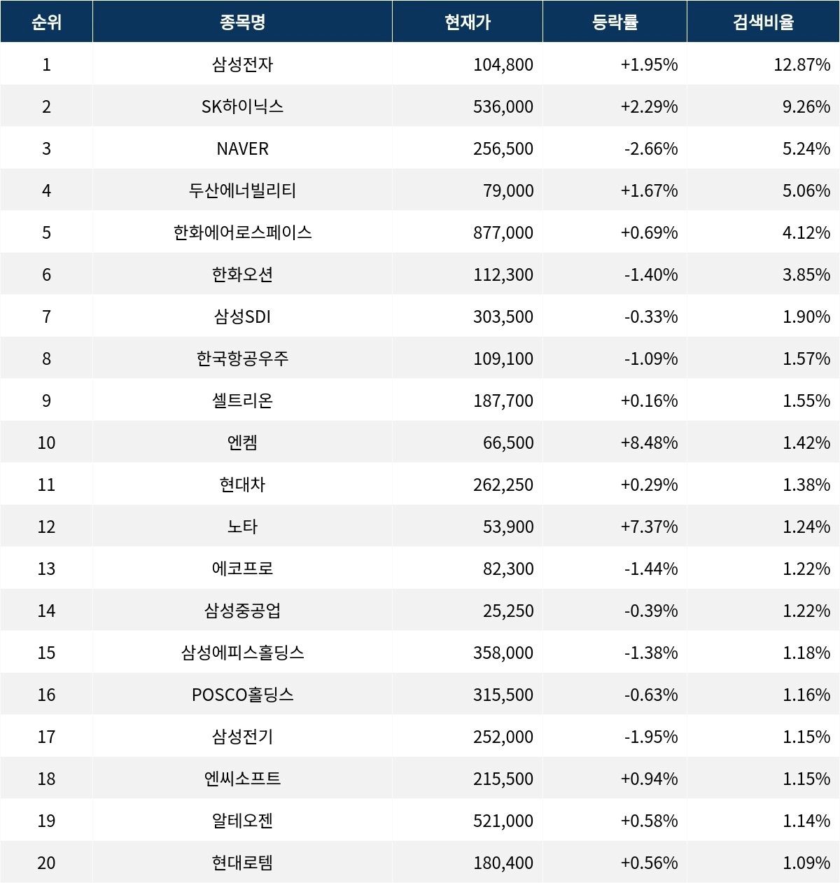이어 SK하이닉스(000660)가 검색비율 2위를 기록하며 2.29%의 상승세를 보이고 있다. 검색비율 3위의 NAVER(035420)는 -2.66% 하락하며 출발했다. 검색비율 4위 두산에너빌리티(034020)는 개장 초반부터 1.67% 상승 중이다. 검색비율 5위 한화에어로스페이스(012450)는 0.69% 상승하며 보합권에 머물고 있다.