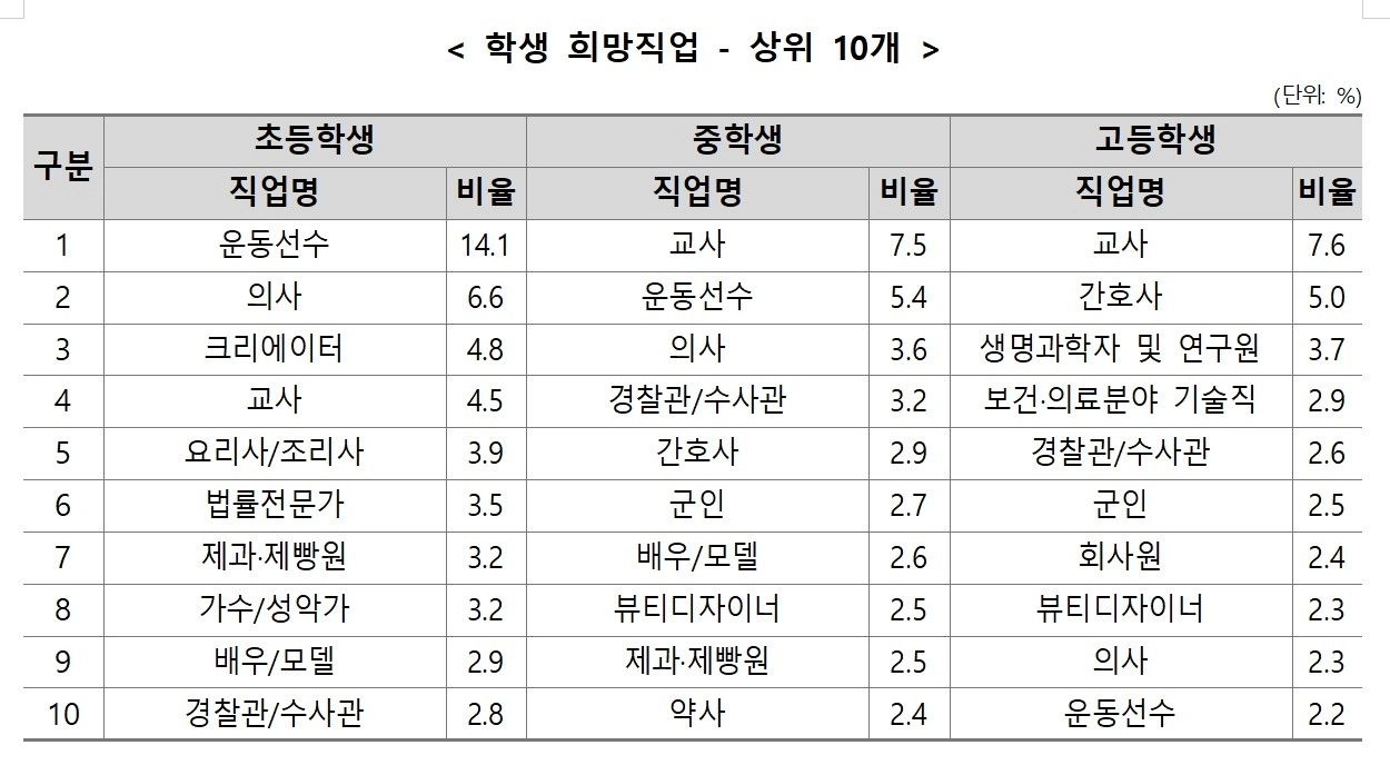 초등학생의 희망 직업 1위는 운동선수(14.1%)로 2018년부터 8년 연속 1위 자리를 지켰다. 2위는 의사(6.6%), 3위는 유튜버 등 크리에이터(4.8%)가 차지했다. 중학생 희망 직업 1위는 교사(7.5%)로 집계됐다. 2~5위는 운동선수(5.4%), 의사(3.6%), 경찰관/수사관(3.2%), 간호사(2.9%) 순이었다. 지난해보다 교사 비율은 0.7%포인트 상승했고, 의사는 5.1%에서 3.6%로 1.5%포인트 하락했다.