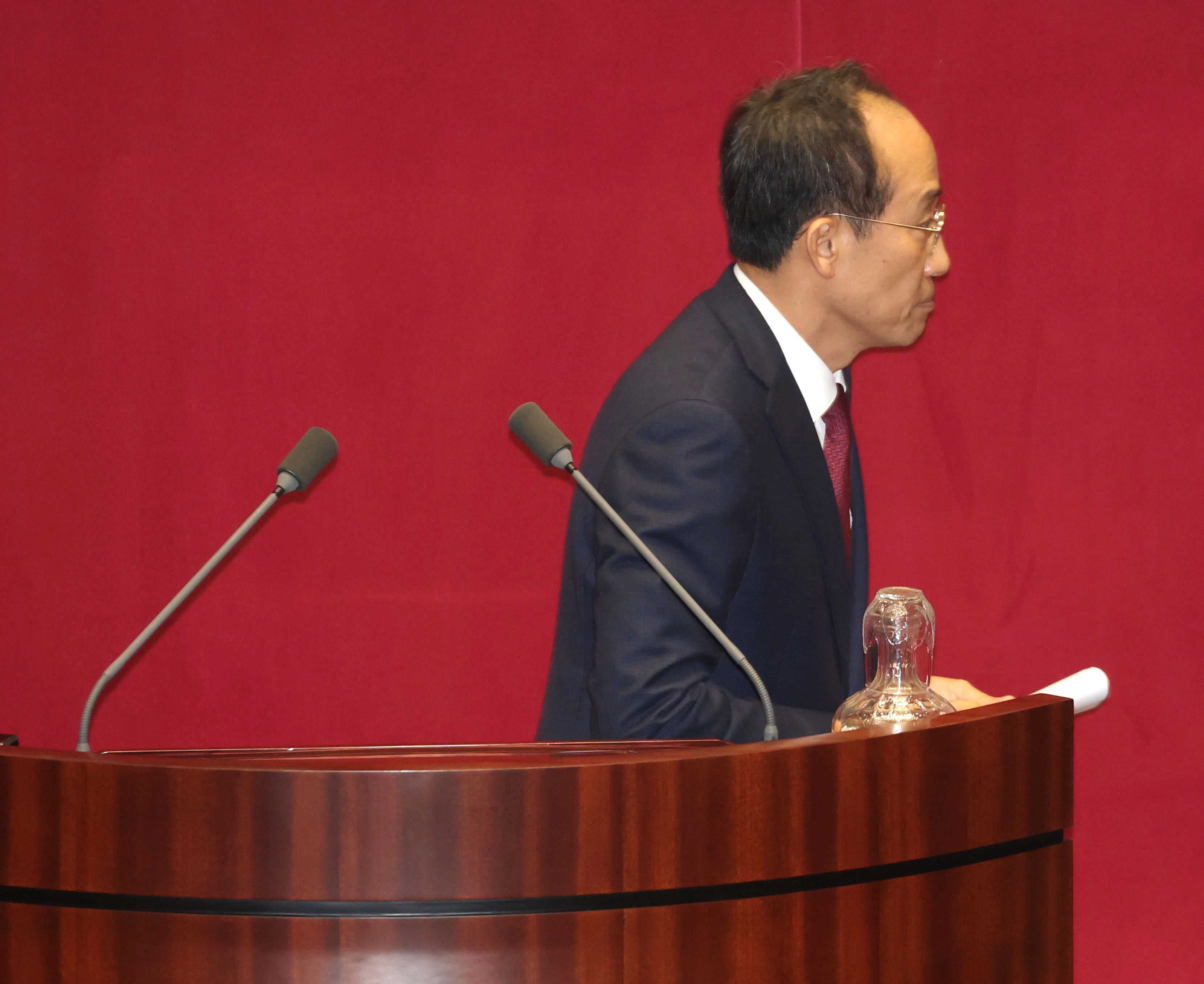 계엄 해제 의결을 방해한 혐의(내란 중요임무 종사)로 구속영장이 청구된 국민의힘 추경호 의원이 27일 국회 본회의에서 자신의 체포동의안에 대한 신상 발언을 마친 뒤 이동하고 있다. 2025.11.27 연합뉴스