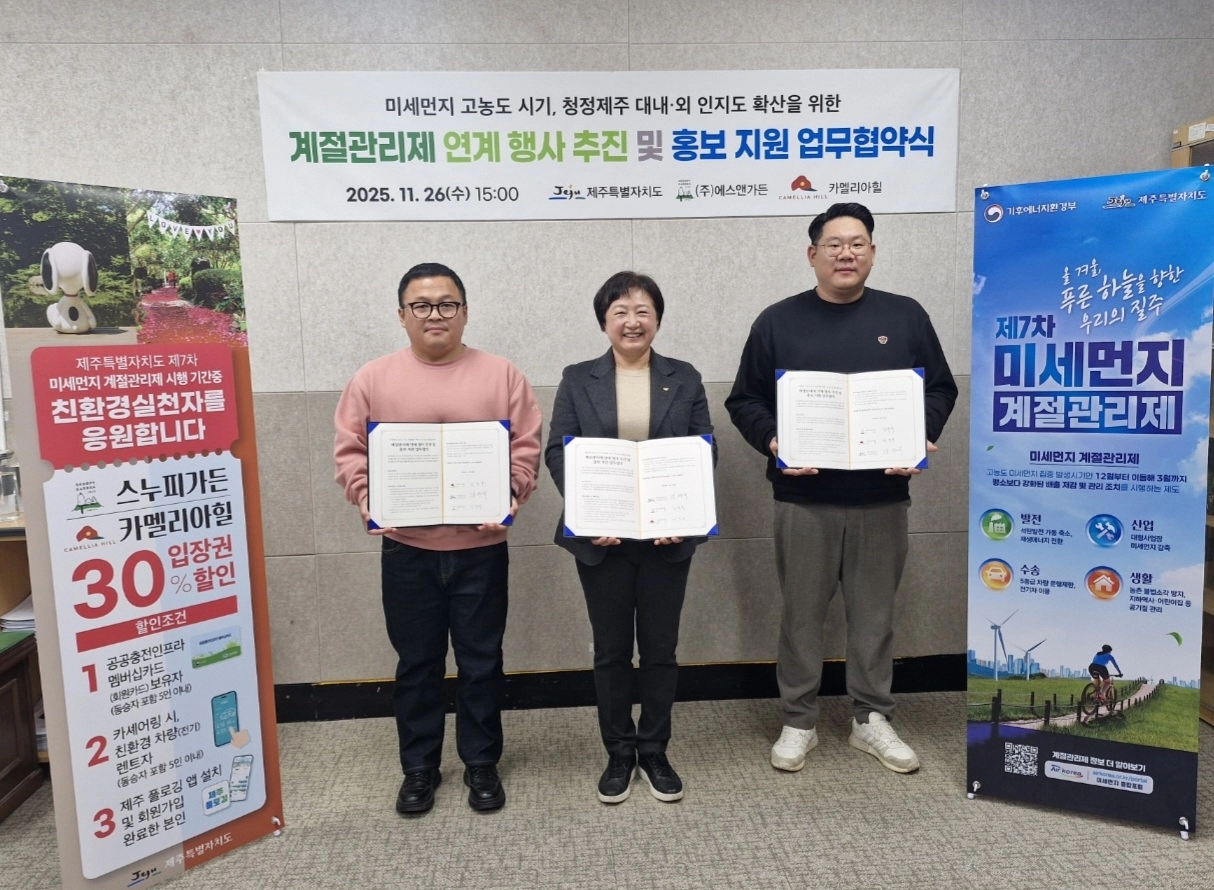 강애숙 제주도 기후환경국장은 “이번 계절관리제는 규제에서 인센티브로 정책 패러다임을 바꾸는 첫 시도”라며 “도민과 관광객이 함께 참여할 수 있는 다양한 친환경 프로그램을 지속적으로 발굴해 푸른 하늘이 일상이 되는 제주를 만들겠다”고 말했다.