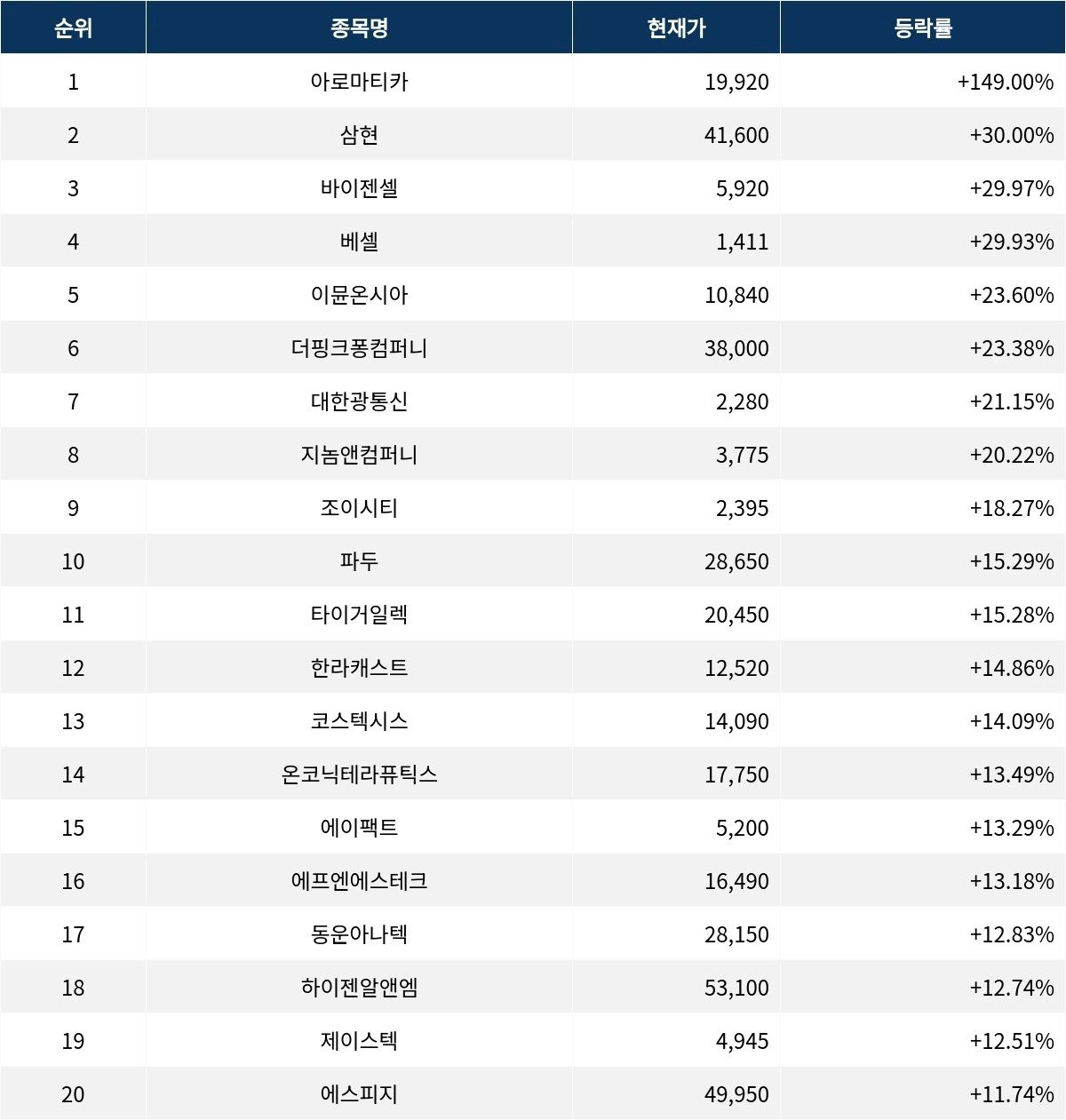 6위 더핑크퐁컴퍼니(403850)는 종가 38,000원으로 23.38% 상승 마감했다. 7위 대한광통신(010170)은 종가 2,280원으로 21.15% 상승 마감했다. 8위 지놈앤컴퍼니(314130)는 종가 3,775원으로 20.22% 상승 마감했다. 9위 조이시티(067000)는 종가 2,395원으로 18.27% 상승 마감했다. 10위 파두(440110)는 종가 28,650원으로 15.29% 상승 마감했다.