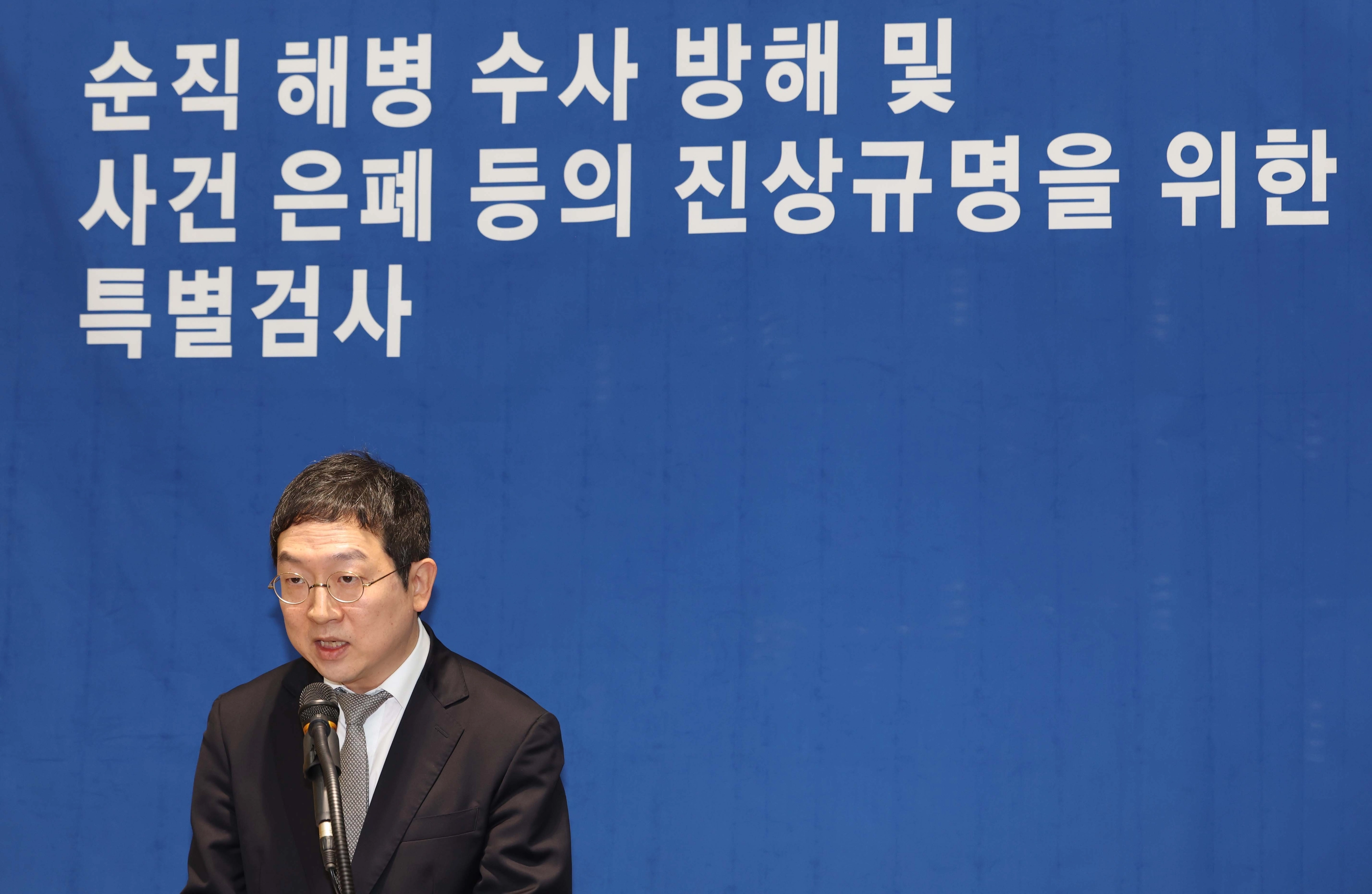 채 상병 사건 외압 의혹을 수사하는 이명현 특별검사팀의 정민영 특검보가 21일 오전 서울 서초구 특검 사무실 브리핑룸에서 수사 결과를 발표하고 있다. 2025.11.21. 공동취재