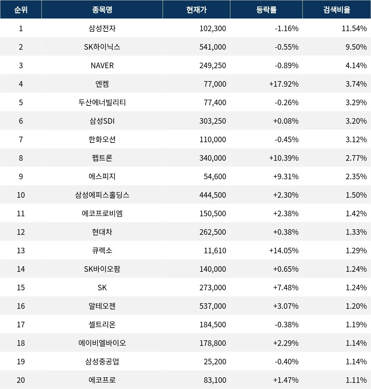 이 밖에도 에코프로비엠(247540) ▲2.38%, 현대차(005380) ▲0.38%, 큐렉소(060280) ▲14.05%, SK바이오팜(326030) ▲0.65%, SK(034730) ▲7.48%, 알테오젠(196170) ▲3.07%, 셀트리온(068270) ▼0.38%, 에이비엘바이오(298380) ▲2.29%, 삼성중공업(010140) ▼0.40%, 에코프로(086520) ▲1.47% 등이 많이 검색되고 있다.