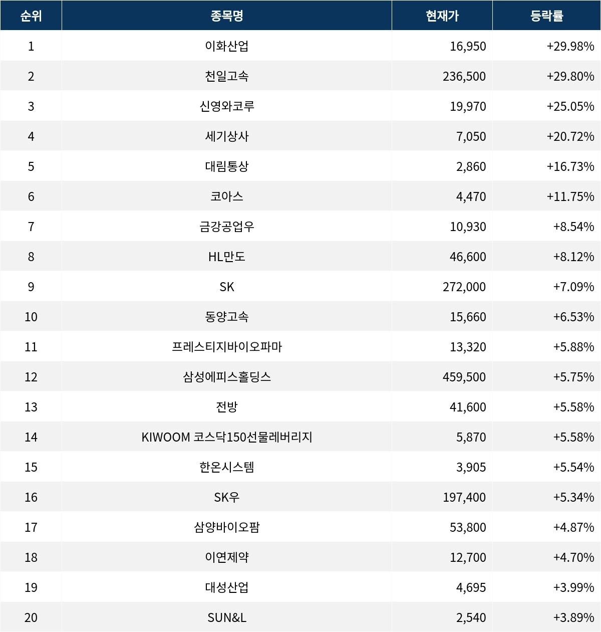 이밖에도 프레스티지바이오파마(950210) ▲5.88%, 삼성에피스홀딩스(0126Z0) ▲5.75%, 전방(000950) ▲5.58%, KIWOOM 코스닥150선물레버리지(291630) ▲5.58%, 한온시스템(018880) ▲5.54%, SK우(03473K) ▲5.34%, 삼양바이오팜(0120G0) ▲4.87%, 이연제약(102460) ▲4.70%, 대성산업(128820) ▲3.99%, SUN&L(002820) ▲3.89% 등을 기록하며 시장에서 활발히 거래되고 있다.
