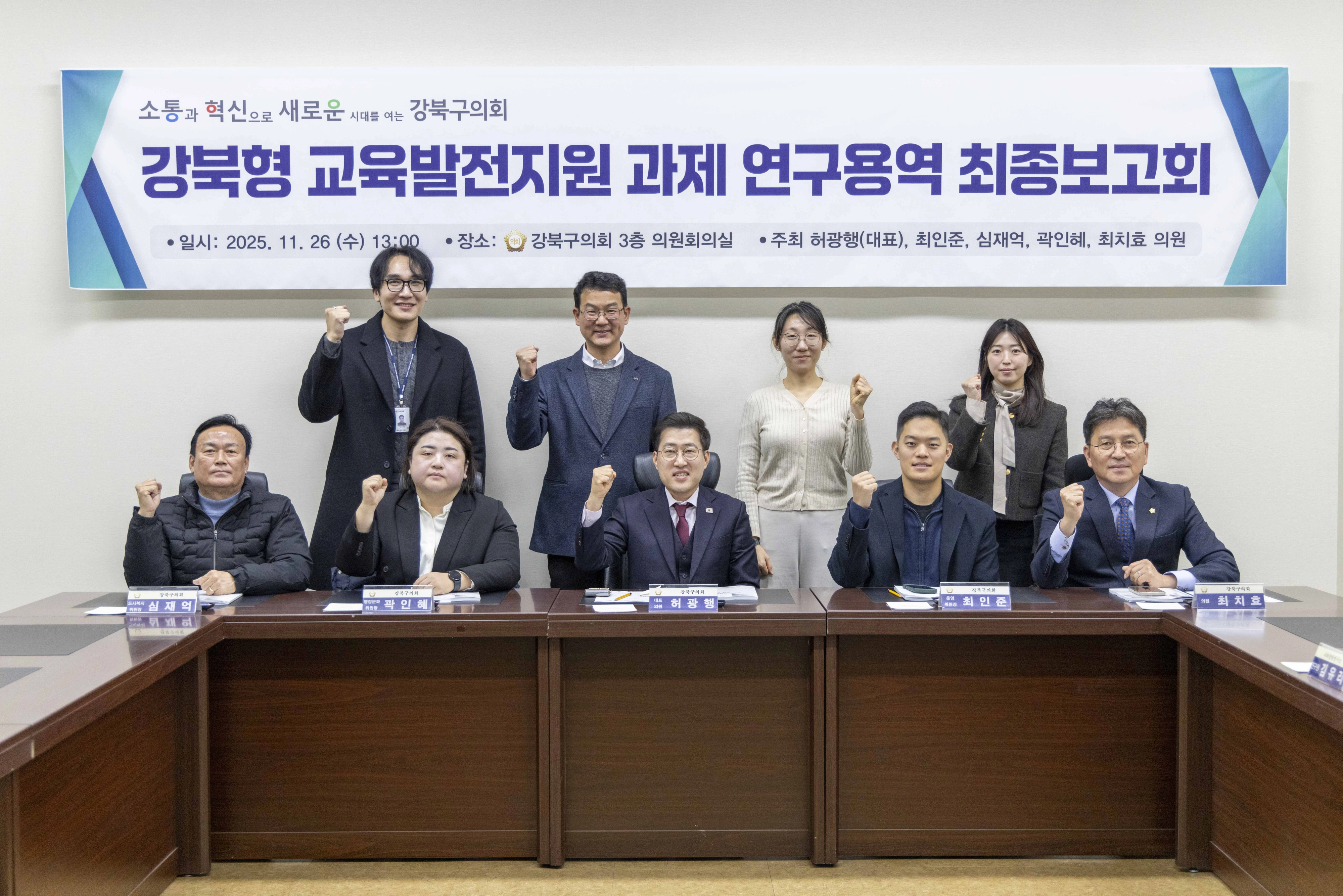 연구회는 지난 26일 의원회의실에서 연구용역 최종보고회를 열고 지난 7월부터 진행해 온 강북구 교육정책 연구 결과를 공유하며 이같이 밝혔다. 이날 보고회에는 허광행 대표의원을 비롯해 연구회 소속 의원들이 참석하여 강북구의 교육 현안을 진단하고 실효성 있는 정책 방향을 논의했다.