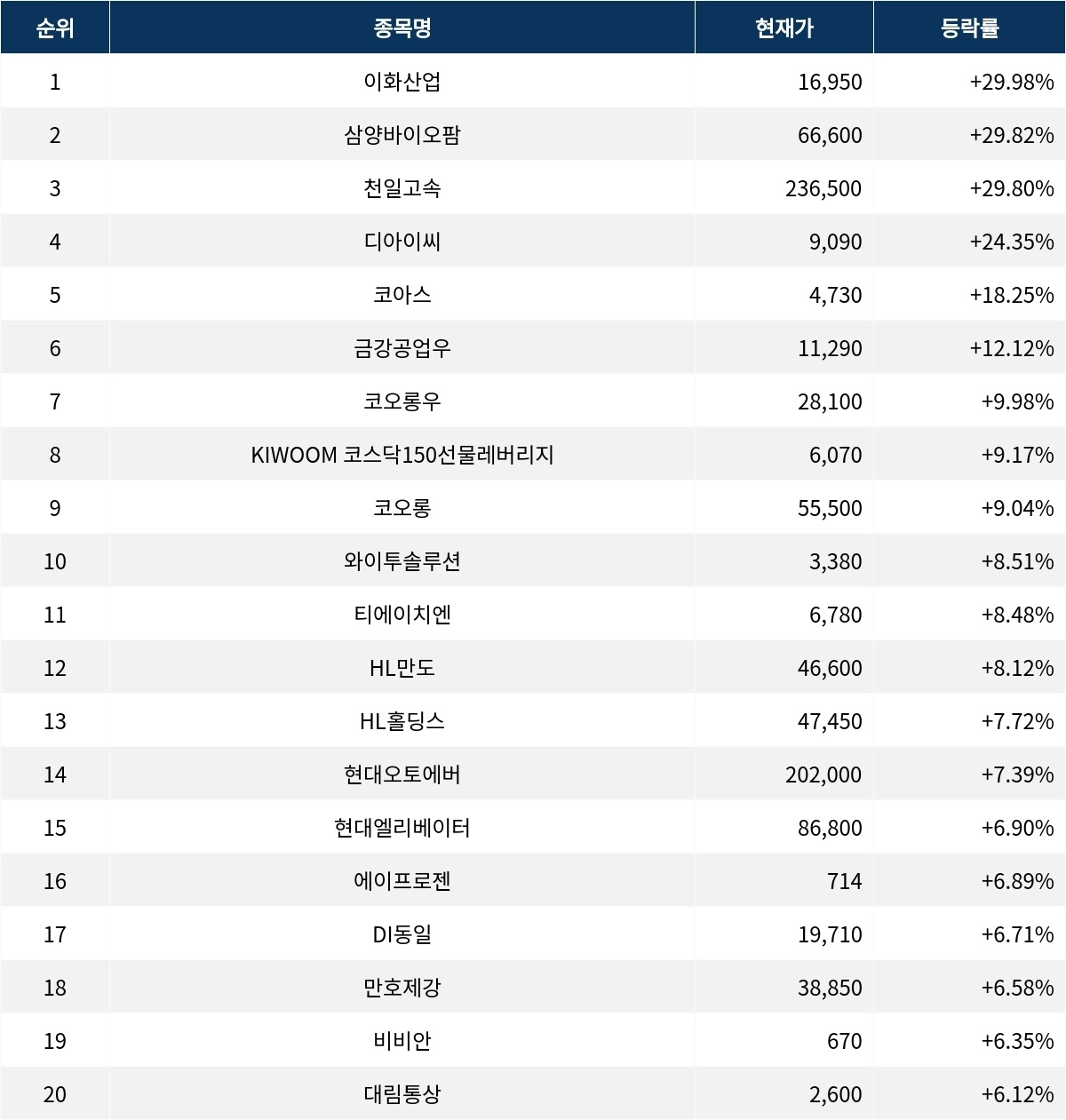 이어 상승률 2위 삼양바이오팜(0120G0)은 주가가 29.82% 폭등하며 종가 66,600원에 상승 마감했다. 상승률 3위 천일고속(000650)의 주가는 236,500원으로 29.80% 폭등하며 부진했다. 상승률 4위 디아이씨(092200)는 24.35% 상승하며 9,090원에 마감했다. 상승률 5위 코아스(071950)는 18.25%의 상승세를 타고 종가 4,730원에 마감했다.