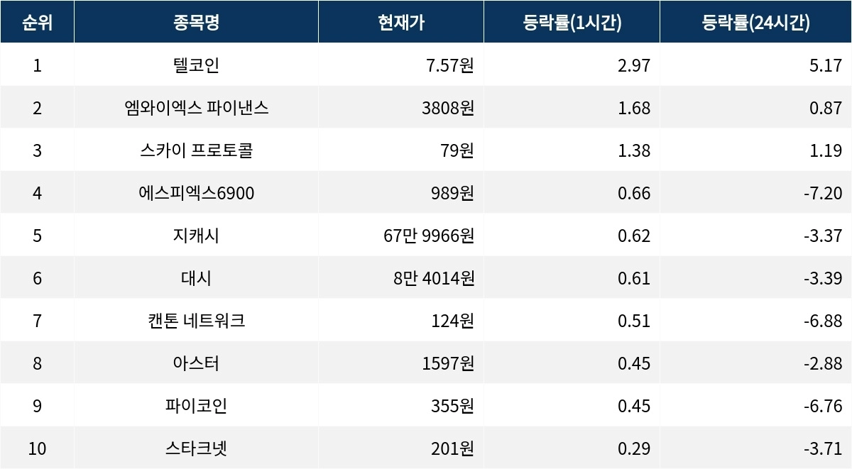 [서울데이터랩]텔코인 엠와이엑스 파이낸스 스카이 프로토콜 1시간 상승률 상위