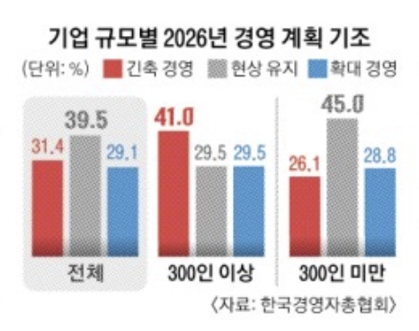한국경영자총협회(경총)가 229개 기업 최고경영자(CEO)와 임원을 대상으로 조사해 30일 내놓은 ‘2026년 기업 경영전망’에 따르면 내년 경영계획 방향을 ‘현상 유지’라고 답한 비율은 39.5%로 가장 많았다. 긴축 경영을 하겠다는 응답은 전년도 49.7%에서 31.4%로 줄었고, 확대경영 응답은 22.3%에서 29.1%로 늘었다. 전반적으로 내년에는 경영 환경이 나아질 것으로 본 셈이다.