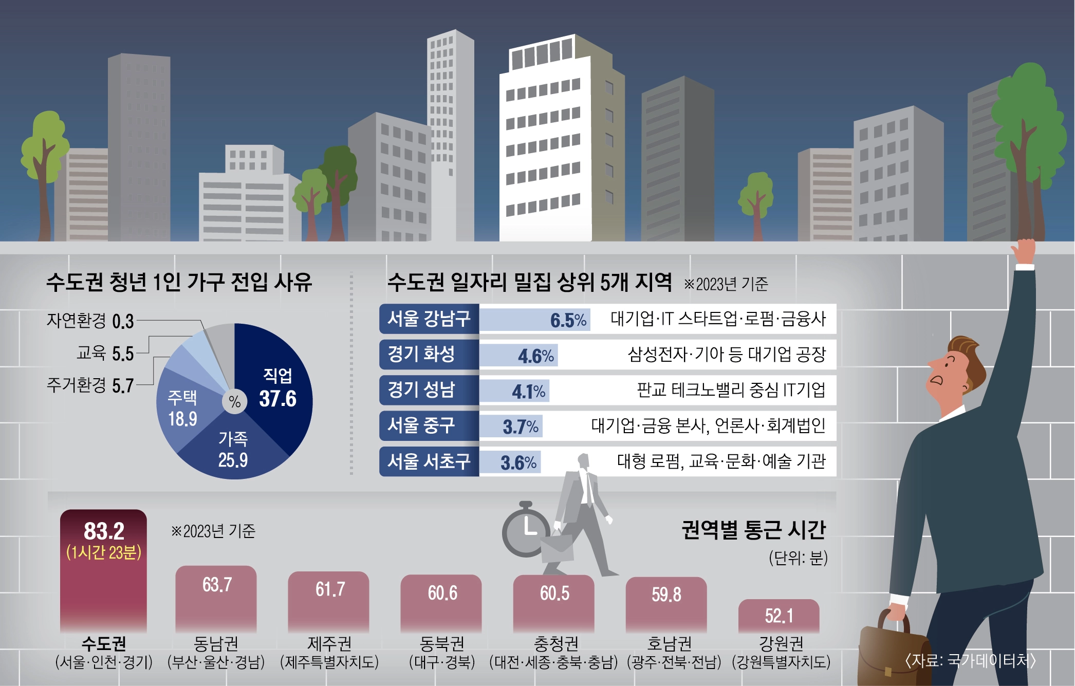 이런 상황에서 수도권의 주거·일자리 소재지 불일치는 심각했다. 국가데이터처의 ‘2023년 근로자 이동행태’를 보면 수도권 내 주요 근무지는 서울 강남구(6.5%), 경기 화성(4.6%), 경기 성남(4.1%), 서울 중구(3.7%), 서울 서초구(3.6%) 순이었다. 화성을 제외하면 청년 인구 순유입 지역과 일자리 지역이 서로 일치하지 않았다. 한미연은 “주요 근무지는 거주 비용이 많이 들기 때문에 청년들은 수도권에 전입한 뒤에도 생계를 위해 길고 긴 통근 시간을 감내해야 하는 상황”이라고 분석했다. 수도권의 평균 통계 시간은 83분 12초로 전국 권역 중 가장 길었다.
