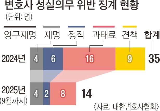 변협에 따르면 성실의무 위반으로 징계받은 변호사 수는 지난해에는 35명이고, 올해는 9월까지 14명에 불과하다. 이에 변협의 징계에 대한 실효성을 지적하는 목소리도 있다. 오영근 한양대 로스쿨 교수는 “징계에도 불구하고 계속해서 문제가 이어진다면 변협 외에 외부 기관 등에서 징계를 내릴 수 있는 방안 등도 검토해 볼 수 있을 것”이라고 말했다.