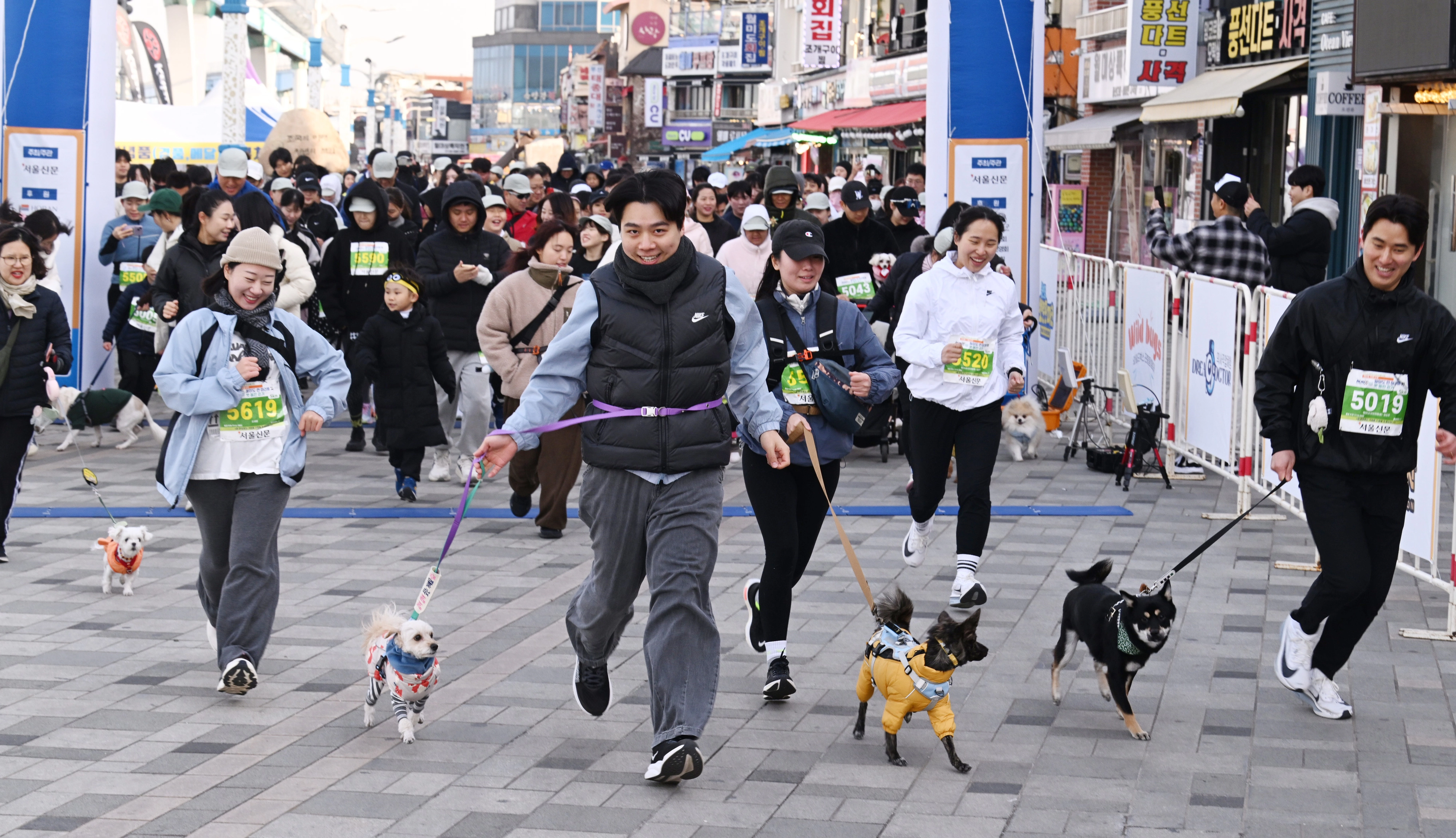 지난 29일 인천 월미도에서 열린 ‘2025 서울신문 월미도 런 및 펫 동반 걷기’ 대회에서 참가자들이 반려견과 함께 5㎞ 코스를 달리고 있다.