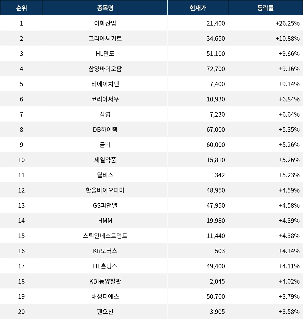 6위 코리아써우(007815)는 현재가 10,930원으로 6.84% 상승 중이다. 7위 삼영(003720)은 현재가 7,230원으로 6.64% 상승 중이다. 8위 DB하이텍(000990)은 현재가 67,000원으로 5.35% 상승 중이다. 9위 금비(008870)는 현재가 60,000원으로 5.26% 상승 중이다. 10위 제일약품(271980)은 현재가 15,810원으로 5.26% 상승 중이다.