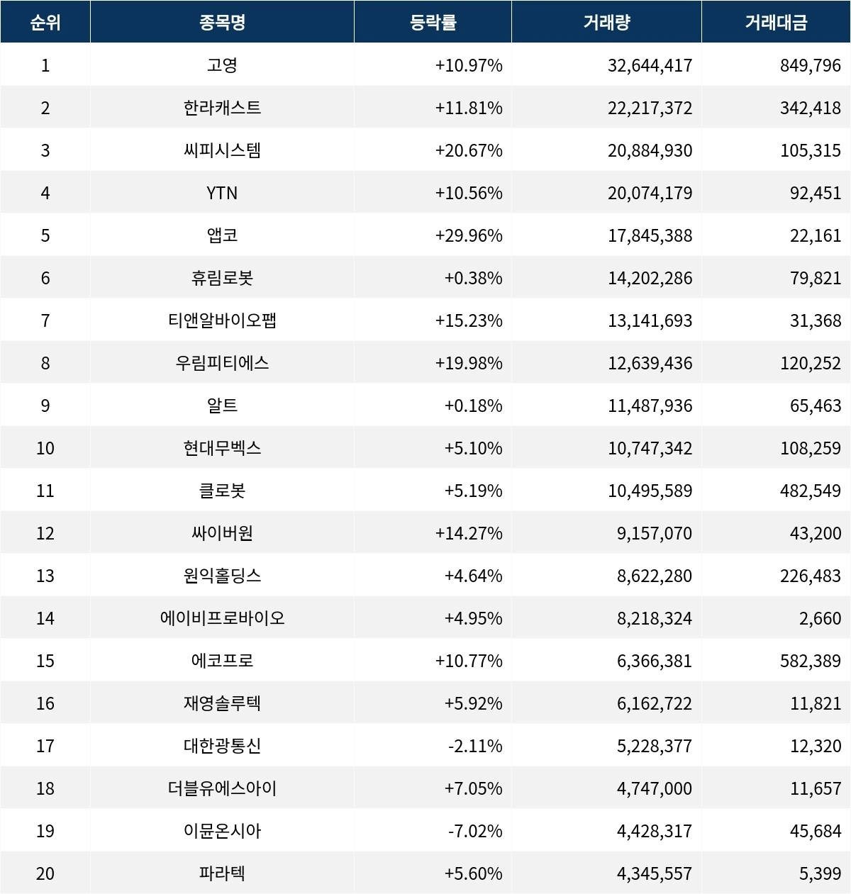 씨피시스템(413630)은 현재가 5,080원으로 거래량 2천만주 이상을 기록하며 3위에 올랐다. 상승률은 20.67%를 기록했다. YTN(040300)의 주가는 4,605원으로 10.56% 상승했으며 거래량은 2천만주를 넘어섰다. 앱코(129890)는 상한가를 기록하며 1,375원에 거래되고 있고, 거래량은 1천7백만주에 달한다. 휴림로봇(090710)은 5,350원으로 보합세를 유지 중이나 1천4백만주의 거래량을 보였다. 티앤알바이오팹(246710)은 2,345원으로 15.23% 상승하며, 우림피티에스(101170)는 9,910원으로 19.98%의 급등세를 보인다. 알트(459550)와 현대무벡스(319400)도 각각 0.18%, 5.10%의 상승세를 보이고 있다.