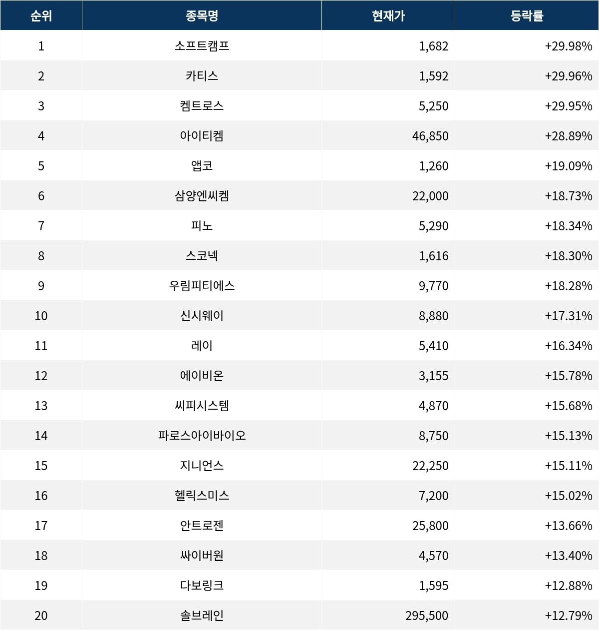6위 삼양엔씨켐(482630)은 종가 22,000원으로 18.73% 급등 마감했다. 7위 피노(033790)는 종가 5,290원으로 18.34% 급등 마감했다. 8위 스코넥(276040)은 종가 1,616원으로 18.30% 급등 마감했다. 9위 우림피티에스(101170)는 종가 9,770원으로 18.28% 급등 마감했다. 10위 신시웨이(290560)는 종가 8,880원으로 17.31% 급등 마감했다.