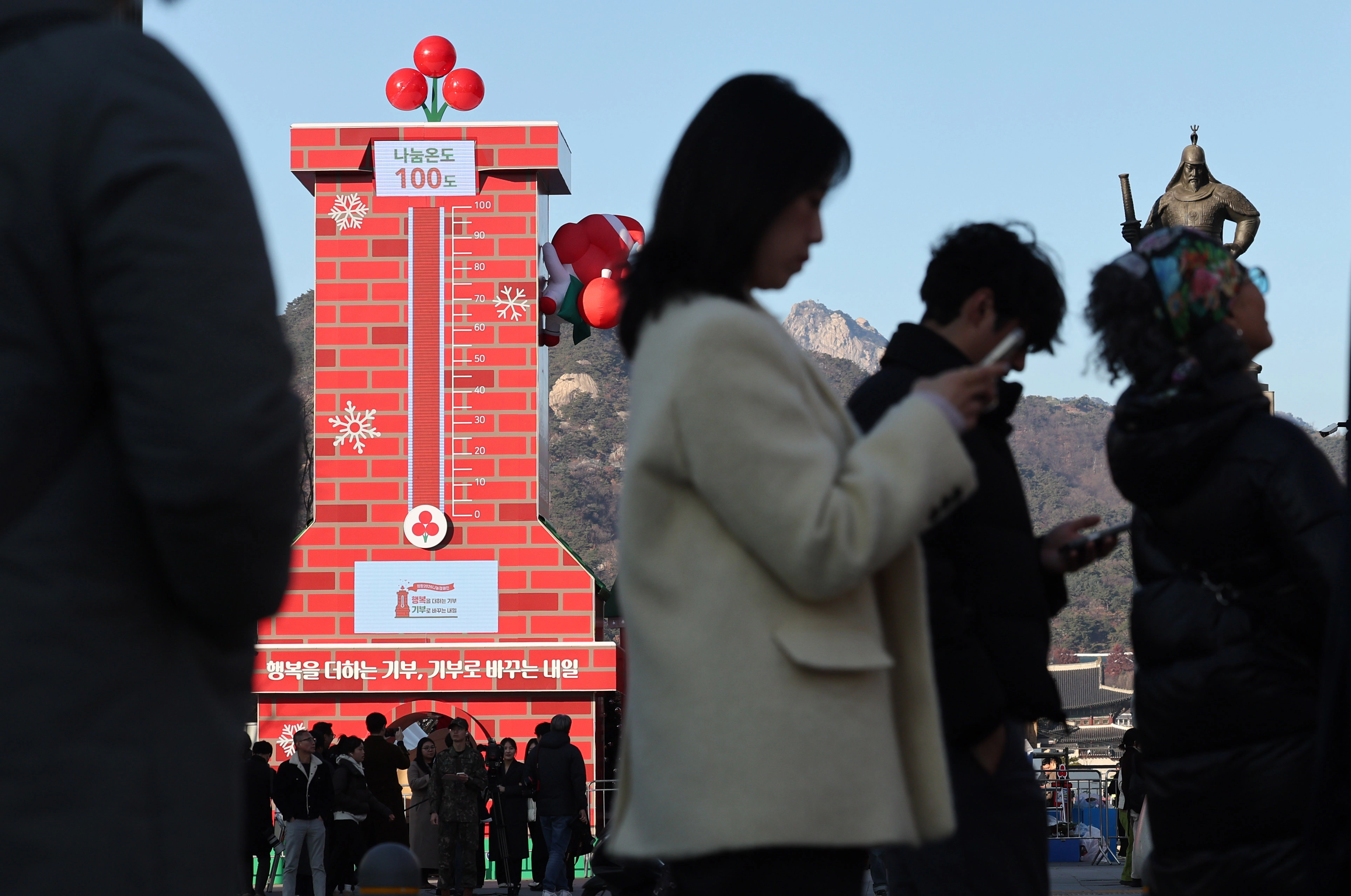 1일 오후 서울 광화문광장에 설치된 사랑의 온도탑이 점등돼 있다. 사랑의 온도탑은 사랑의열매 사회복지공동모금회 주최로 이날 시작한 ‘희망2026나눔캠페인’의 상징물이다. 모금 목표액 4500억원의 1%인 45억원이 모일 때마다 나눔온도가 1도씩 상승한다. 뉴스1