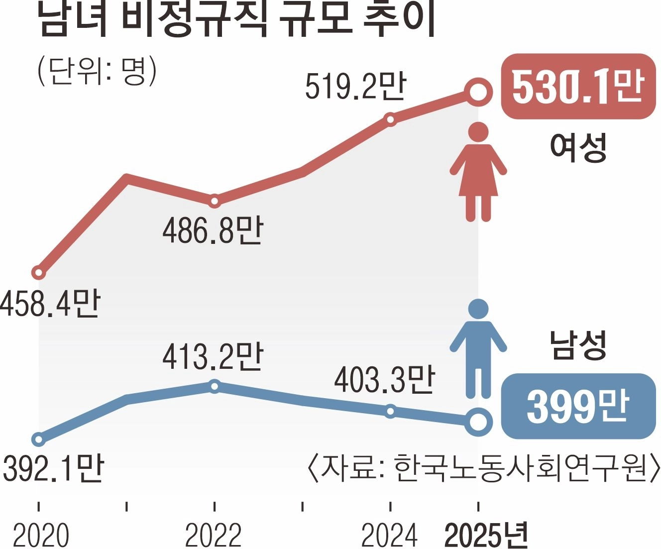 여성 비정규직 530만명… 남성보다 131만명 더 많아