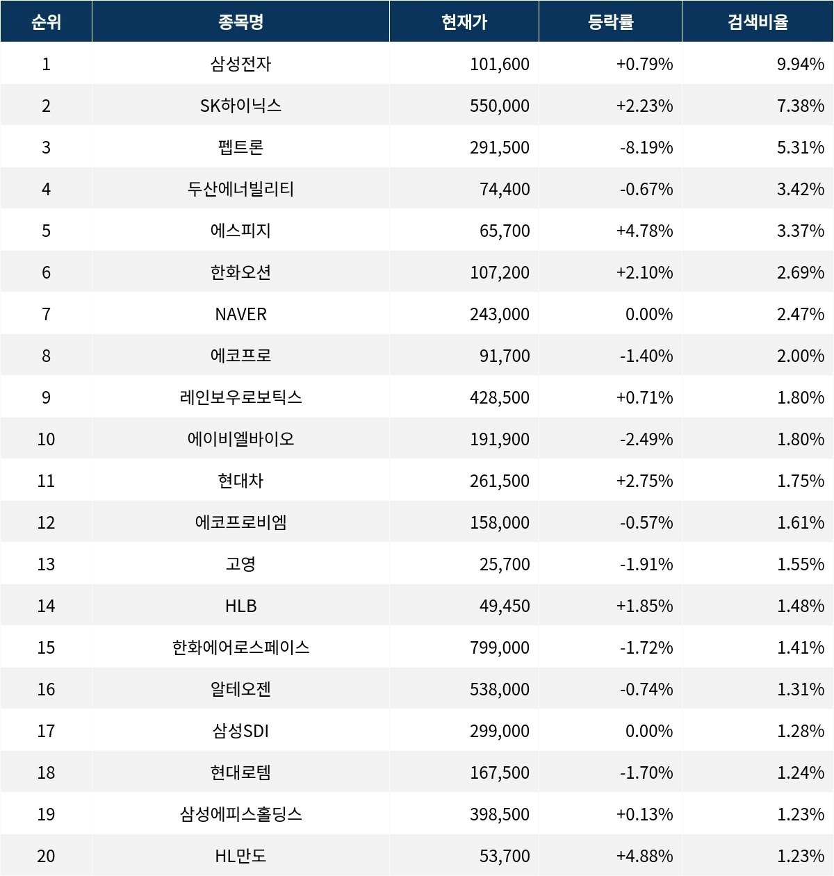 이어 SK하이닉스(000660)가 검색비율 2위를 기록하며 2.23%의 상승세를 기록하고 있다. 검색비율 3위의 펩트론(087010)은 8.19% 하락하며 하락세를 보이고 있다. 검색비율 4위 두산에너빌리티(034020)는 개장 초반부터 0.67% 하락률로 큰 움직임을 보이지 않고 있다. 검색비율 5위 에스피지(058610)는 4.78% 상승하며 순조롭게 출발하는 모습이다.