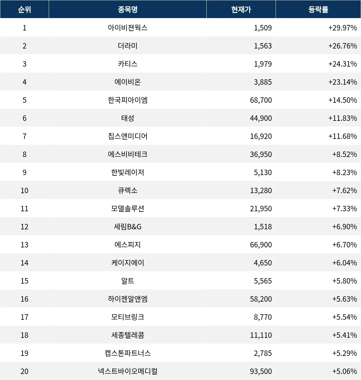 6위 태성(323280)은 현재가 44,900원으로 11.83% 상승 중이다. 7위 칩스앤미디어(094360)는 현재가 16,920원으로 11.68% 상승 중이다. 8위 에스비비테크(389500)는 현재가 36,950원으로 8.52% 상승 중이다. 9위 한빛레이저(452190)는 현재가 5,130원으로 8.23% 상승 중이다. 10위 큐렉소(060280)는 현재가 13,280원으로 7.62% 상승 중이다.