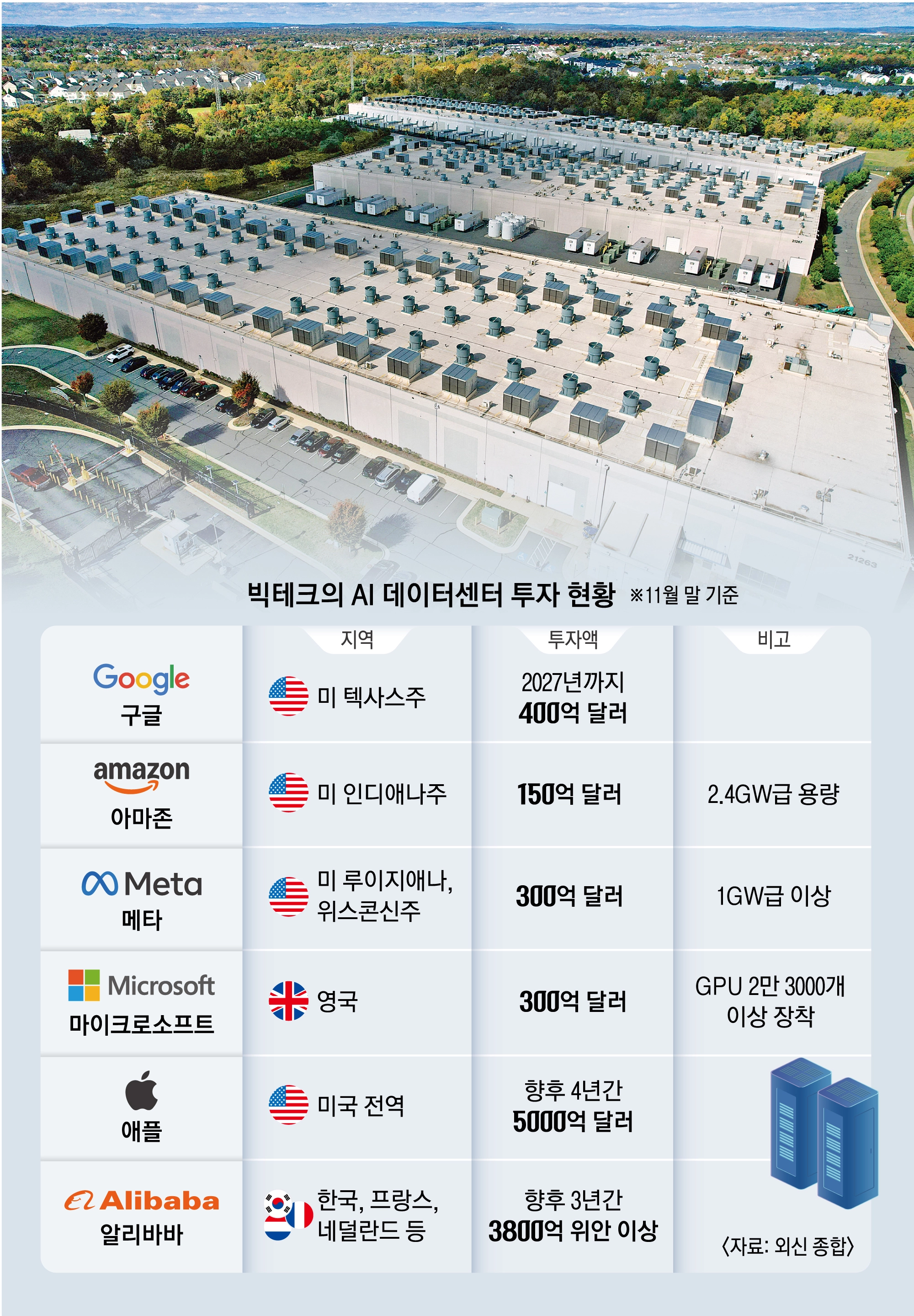 구글은 미 텍사스주에 400억 달러(약 58조원)를 들여 데이터센터 3곳을 신설하는 것 외에 핀란드에 11억 달러, 말레이시아에 20억 달러를 투자한다고 최근 밝혔다. 마이크로소프트(MS)는 지난 9월 영국에 300억 달러 규모 AI 인프라 투자 계획을 발표했다.