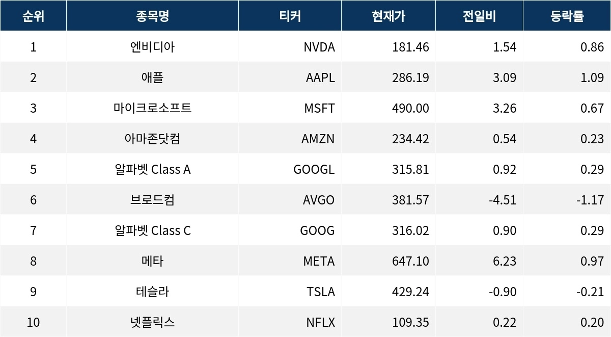 엔비디아는 181.46달러로 마감하며 전일 대비 1.54달러 올랐다. 애플은 286.19달러로 3.09달러 상승하면서 1.09%의 상승률을 기록했다. 마이크로소프트는 490.00달러로 거래를 마쳤으며, 전일 대비 3.26달러 증가했다.