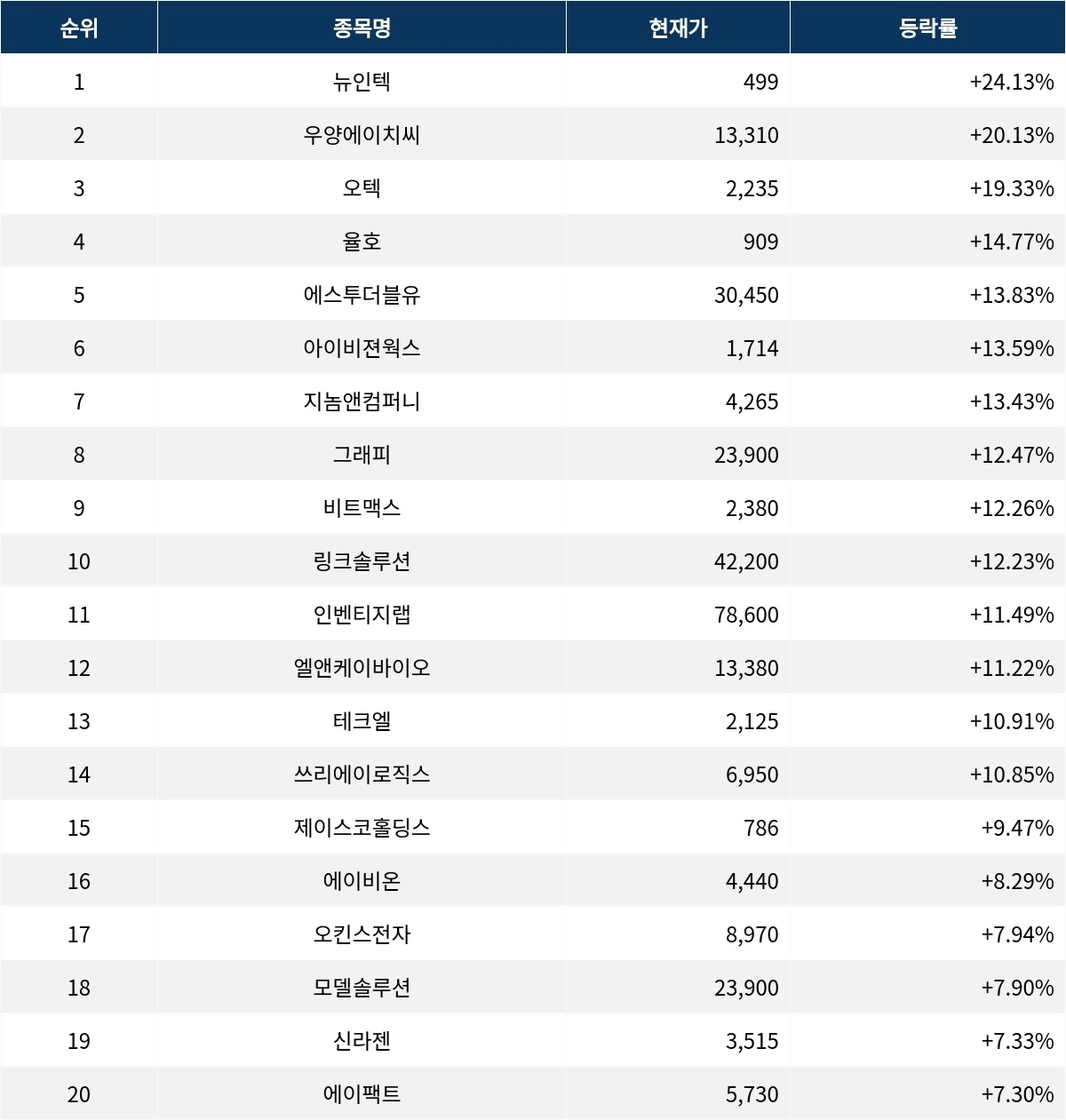 [서울데이터랩]뉴인텍 24.13% 폭등…실시간 상승률 1위