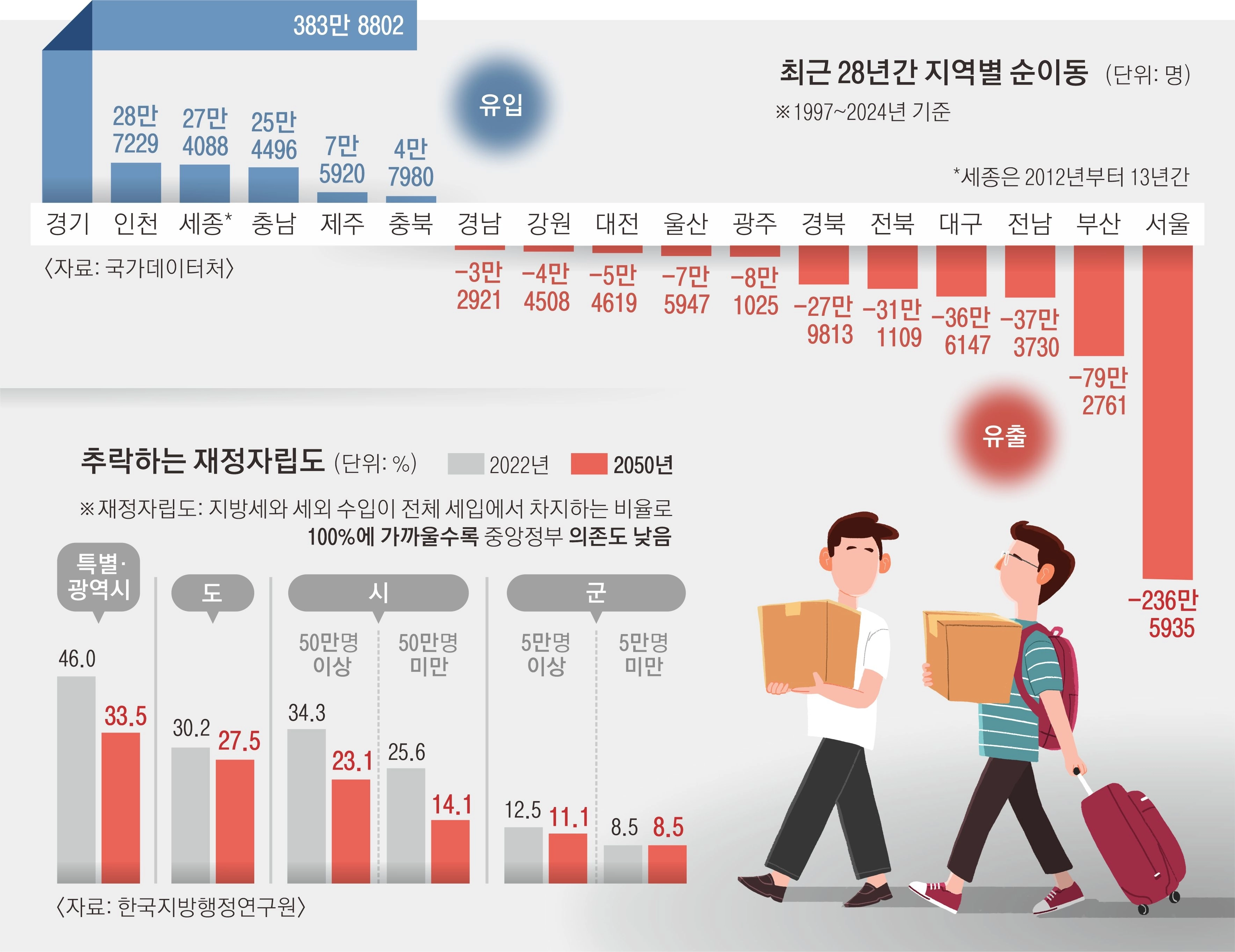 인구의 절반 이상이 수도권에 빼곡히 몰려 살면서 비수도권이 ‘소멸’ 위기에 내몰렸다. 부산·대구·광주·대전·울산 등 광역시가 권역별 거점으로서 인구의 ‘상경’을 막는 방파제 역할을 제대로 하지 못하기 때문이란 지적이 나온다. 게다가 인구감소지역 사이 더 많은 지방 재정 확보를 위한 인구 빼앗기 ‘제로섬 게임’까지 벌어지고 있다.