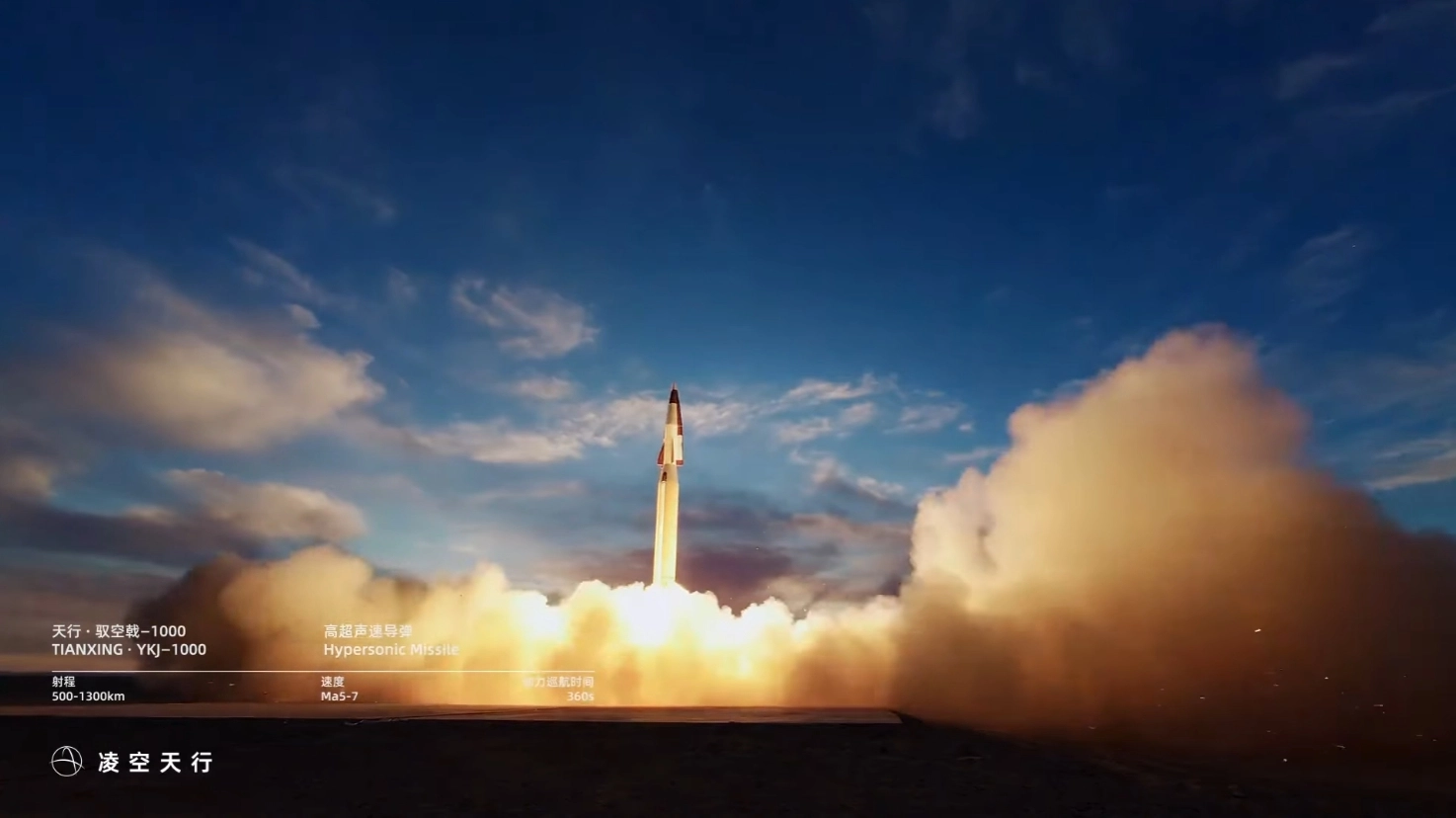 중국 베이징에 있는 항공우주 기업 링콩톈싱이 개발한 저가 극초음속 미사일 ‘YKJ-1000’이 사막으로 추정되는 곳에서 시험 발사를 하는 모습. 업체가 공개한 영상에는 미국 항모 전단과 일본 열도 주요 도시를 표적 삼아 타격하는 가상 화면이 담겼다. 링콩톈싱 홈페이지 동영상 캡처