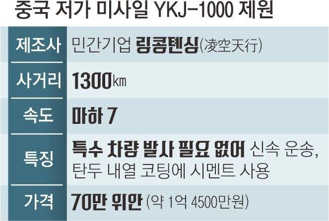 3일 홍콩 사우스차이나모닝포스트(SCMP) 보도에 따르면 지난달 25일 민간기업 링콩톈싱이 속도 마하 7에 사거리가 1300㎞에 이르지만 가격은 70만 위안(약 1억 4500만원)에 불과한 저가형 미사일 ‘YKJ-1000’을 출시했다.